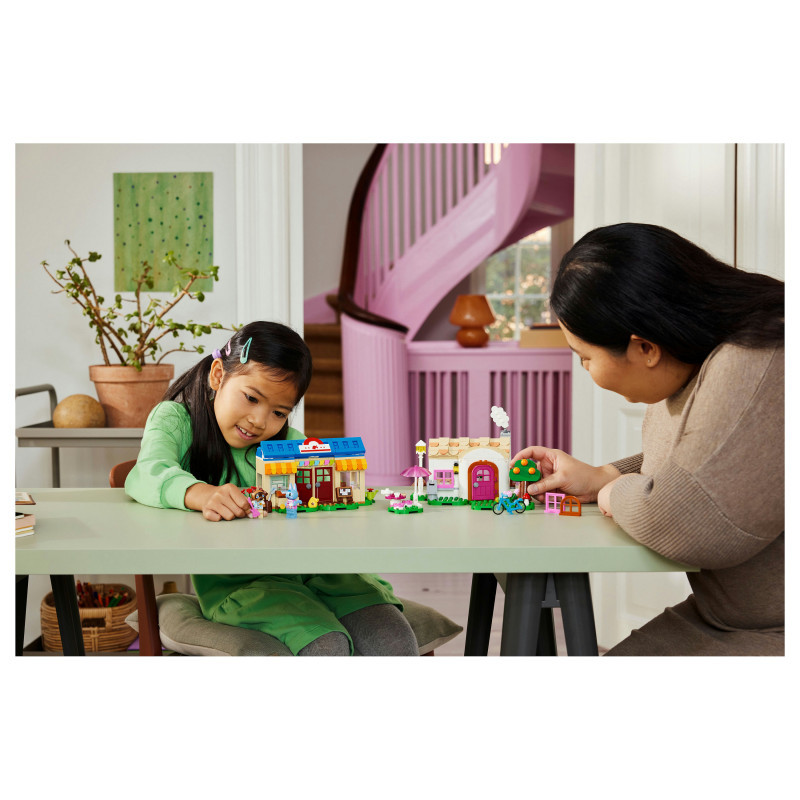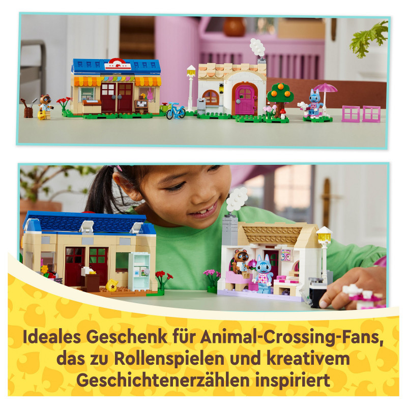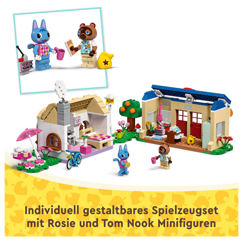 Customisable kids’ toy – Buildable toy comes with Rosie and Tom Nook minifigures, 2 iconic Animal Crossing™ buildings, lots of accessories and interchangeable baseplates