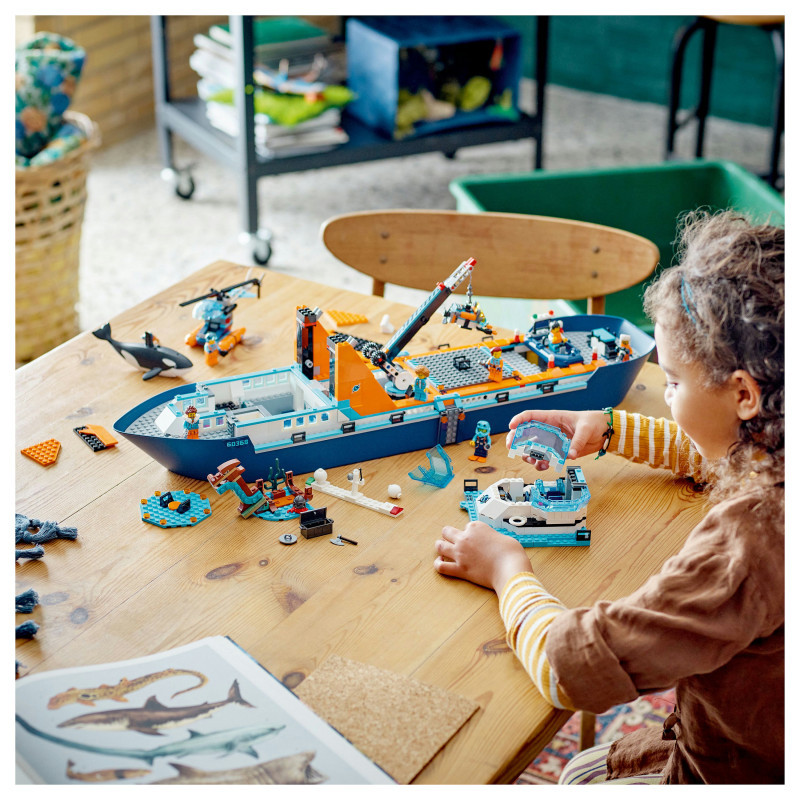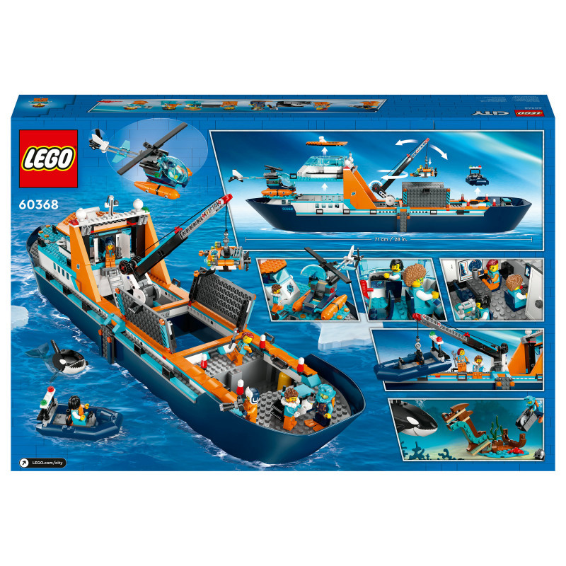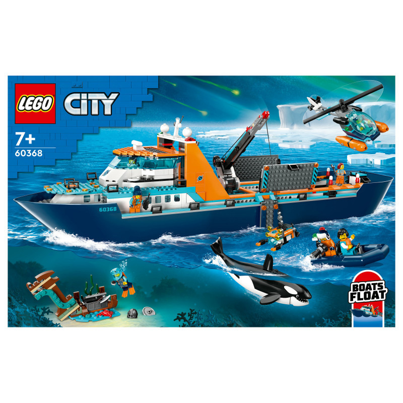 "LEGO City Arctic Explorer Ship. Product type: Building set, Recommended age (min): 7 yr(s), Material: Plastic, Number of pieces: 815 pc(s). Package weight: 2.66 kg"\n"Fun adventures lie on the horizon with the mighty LEGO® City Arctic Explorer Ship (60368). This huge floatable toy boat is loaded with realistic detailing for imaginative exploration adventures. This premium playset also includes a helicopter, dinghy, underwater ROV sub and a Viking shipwreck, plus a treasure chest, 7 minifigures and an orca figure.