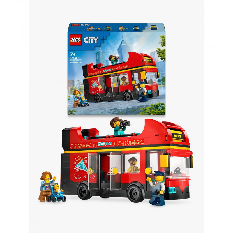 "LEGO Red Double-Decker Sightseeing Bus. Product type: Building set, Recommended age (min): 7 yr(s), Material: Plastic, Number of pieces: 384 pc(s). Package weight: 607 g"\n"Treat kids to fun city tour adventures with this LEGO® City Red Double-Decker Sightseeing Bus toy (60407) for ages 7 and over. Kids can rotate the destination display, pick up waiting passengers and seat them on the lower deck or open-air sightseeing deck. This iconic model is great for display and includes and includes 4 minifigures, including a baby figure with a buggy, for imaginative play and storytelling.