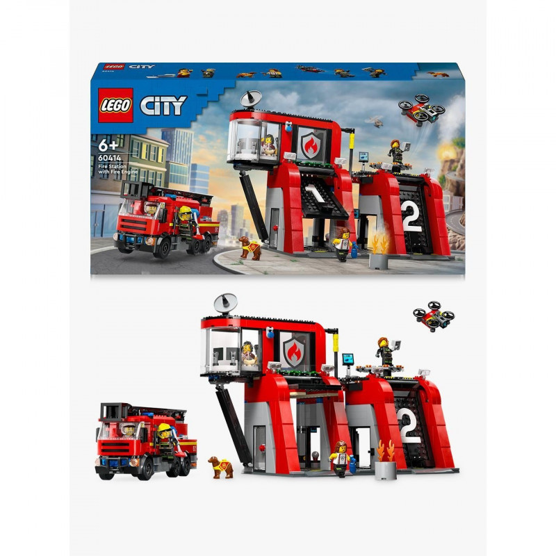"LEGO Fire Station with Fire Engine. Product type: Building set, Recommended age (min): 6 yr(s), Material: Plastic, Number of pieces: 843 pc(s). Package weight: 1.78 kg"\n"Spark kids’ imaginations with the LEGO® City Fire Station with Fire Engine (60414) toy playset for ages 6 and over. The station features a modern control centre, kitchenette and sleeping quarters above an equipment area and 2 garages with tall up-and-over doors. The set also includes a toy drone and a cool fire engine with a modular ladder and extinguisher attachments. Mobilise the 5 fire-crew minifigures and fire dog figure for hours of action-packed firefighting role play. Kids can use this set with others from the LEGO City range (sold separately) for even bigger adventures!