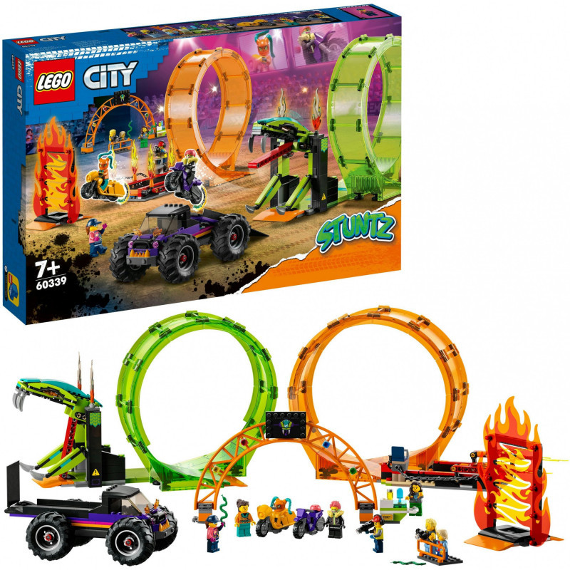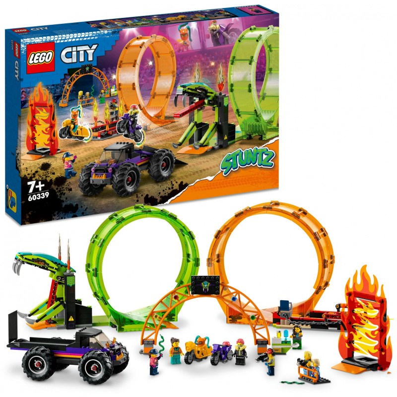 "LEGO City Double Loop Stunt Arena. Product type: Building set, Recommended age (min): 7 yr(s), Material: Plastic, Number of pieces: 598 pc(s). Package weight: 1.47 kg"\n"This LEGO® City Double Loop Stunt Arena (60339) playset is packed with features and comes with 2 flywheel-powered stunt bikes and a monster truck with a ramp for performing real stunts. Arena props include a toy wall of flames, snapping snake loop and a loop of fire, plus lots of cool accessories. Just add the 7 minifigures, including 2 stunt bikers, for exciting shows and competitions.