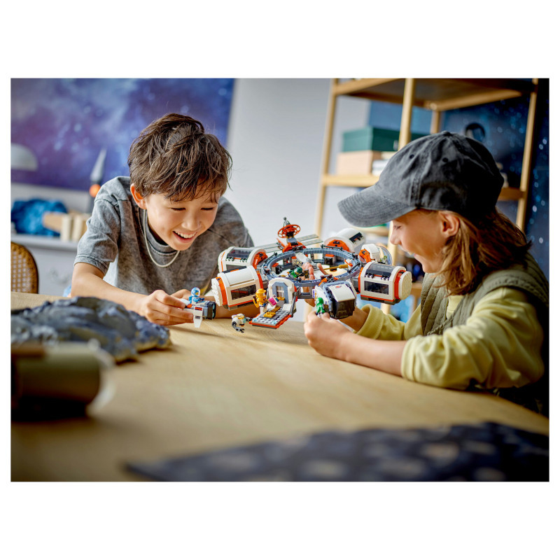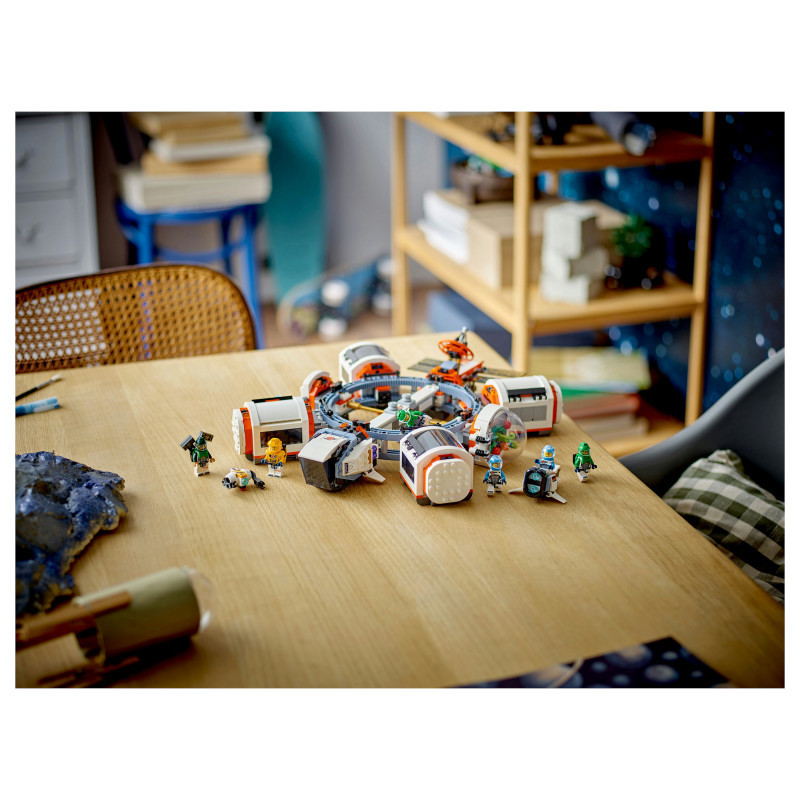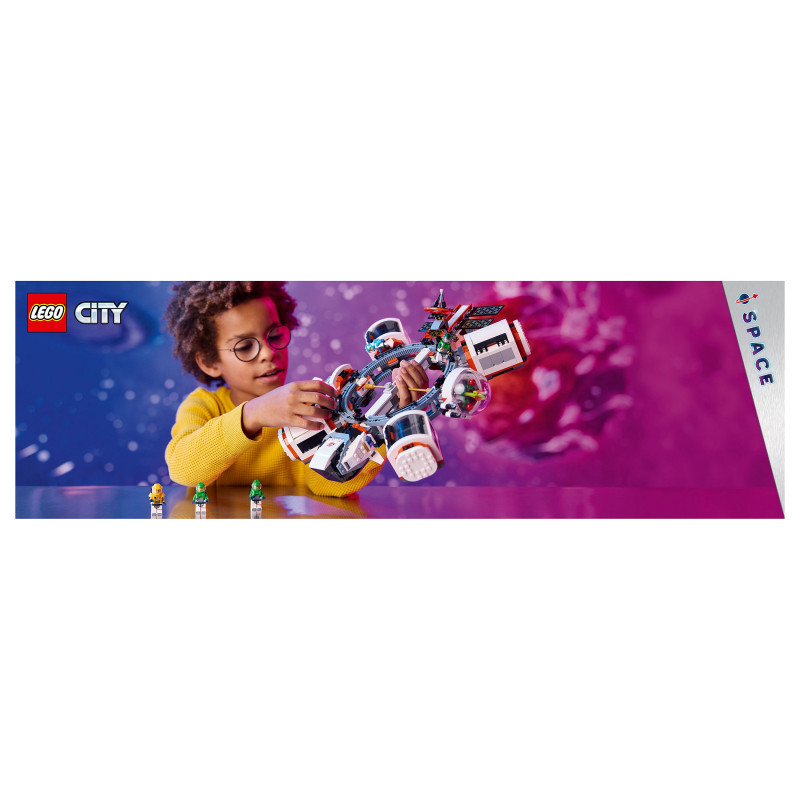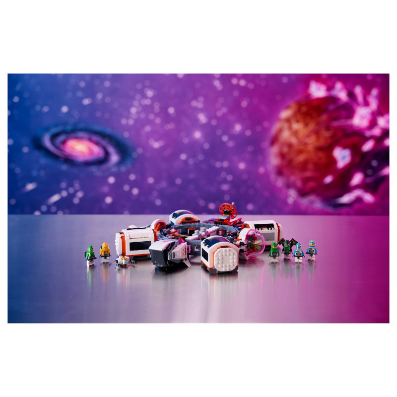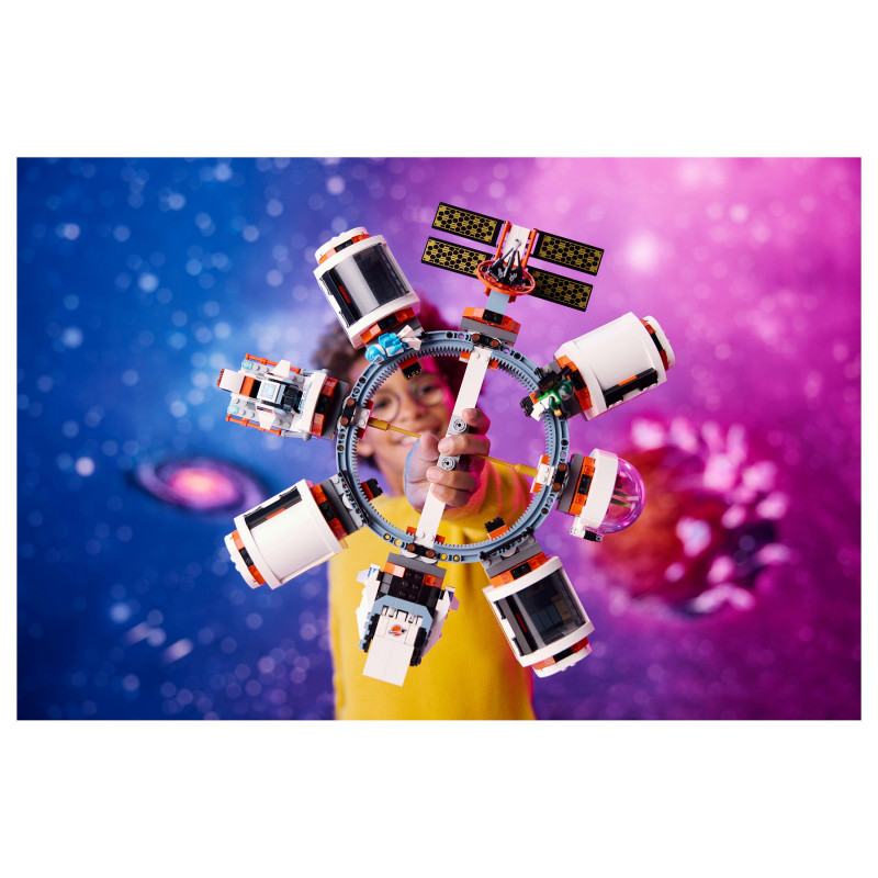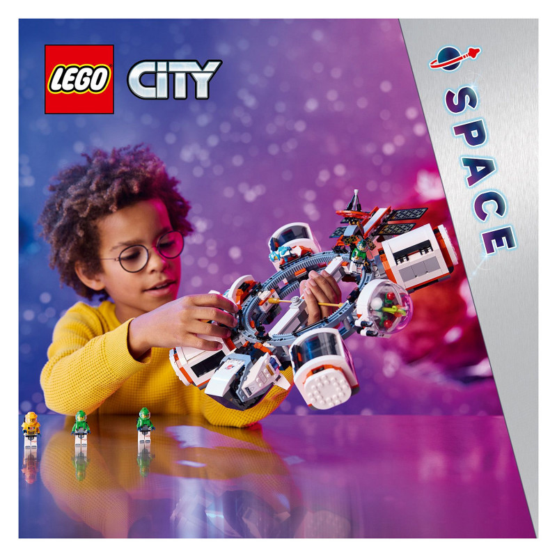 "LEGO City Modular Space Station. Product type: Building set, Recommended age (min): 7 yr(s), Material: Plastic, Number of pieces: 1097 pc(s). Package weight: 1.69 kg"\n"Treat a budding astronaut with the 7+ LEGO® City Modular Space Station model playset (60433). This futuristic space ring is an orbiting anchor for docking spacecraft and room pod modules, including a satellite, space bike, shuttle, exploration science lab, repair workshop, kitchen, sleeping quarters and a biodome. Kids can switch the modules around to create their perfect space station and connect them to the shuttle to create a cool space train. The set also features 6 space crew minifigures for epic space adventures.