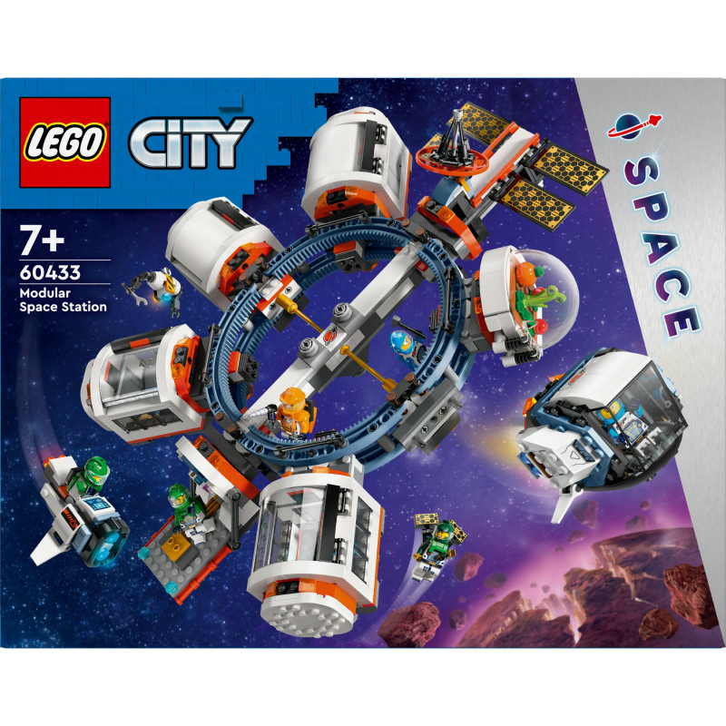 "LEGO Modular Space Station. Product type: Building set, Recommended age (min): 7 yr(s), Material: Plastic, Number of pieces: 1097 pc(s). Package weight: 1.69 kg"\n"Treat a budding astronaut with the 7+ LEGO® City Modular Space Station model playset (60433). This futuristic space ring is an orbiting anchor for docking spacecraft and room pod modules, including a satellite, space bike, shuttle, exploration science lab, repair workshop, kitchen, sleeping quarters and a biodome. Kids can switch the modules around to create their perfect space station and connect them to the shuttle to create a cool space train. The set also features 6 space crew minifigures for epic space adventures.