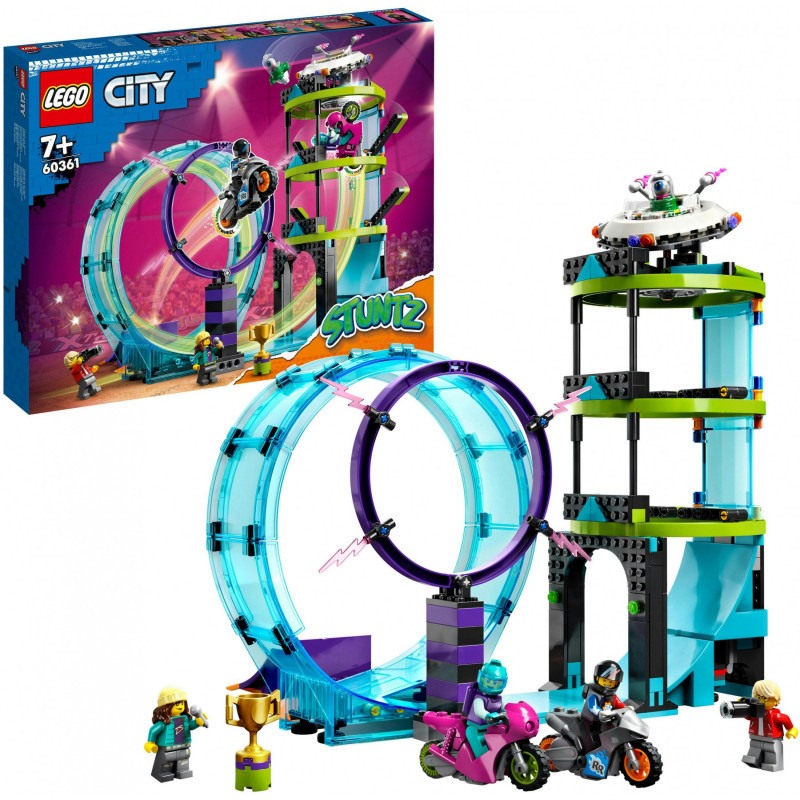 "LEGO City Ultimate Stunt Riders Challenge. Product type: Building set, Recommended age (min): 7 yr(s), Theme: City Stuntz, Material: Plastic, Number of pieces: 385 pc(s). Package weight: 1.05 kg"\n"Hours of action-packed fun await with the LEGO® City Ultimate Stunt Riders Challenge (60361). This triple-feature 7+ set comes with 2 toy stunt motorcycles and 3 combinable stunt apparatus, including a 360° loop, a ring of fire and a fun ‘alien tower’ challenge. Kids can put their skills to the test, stage epic shows and compete with friends and family to take the winner’s trophy.