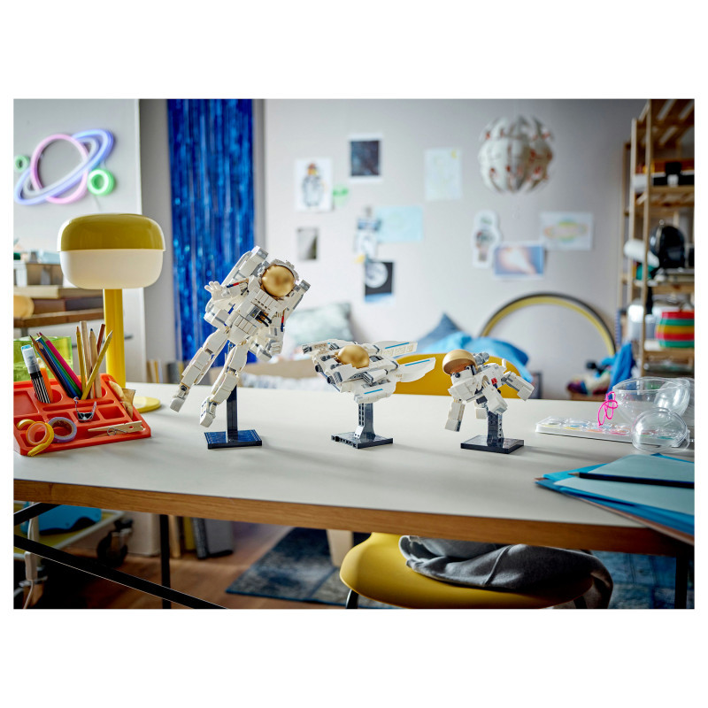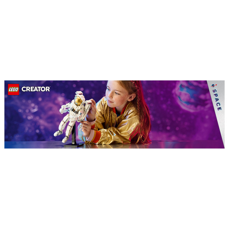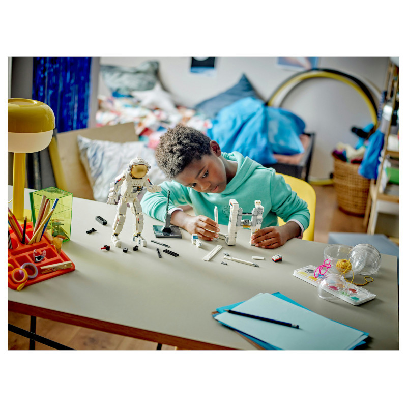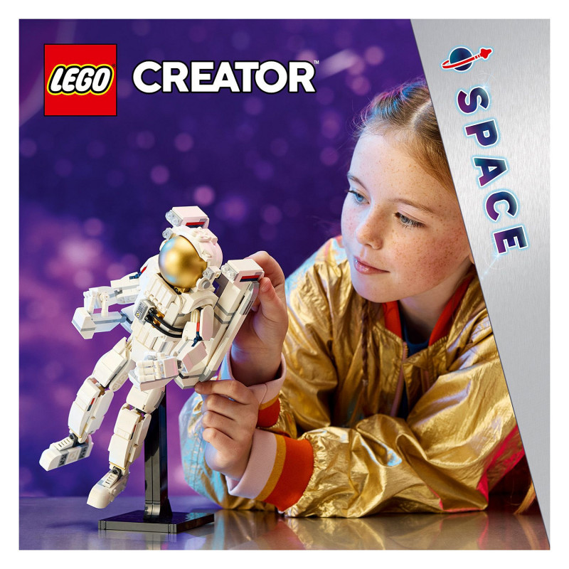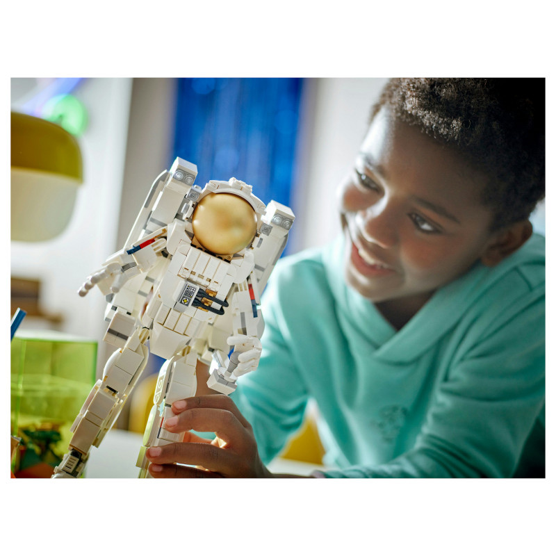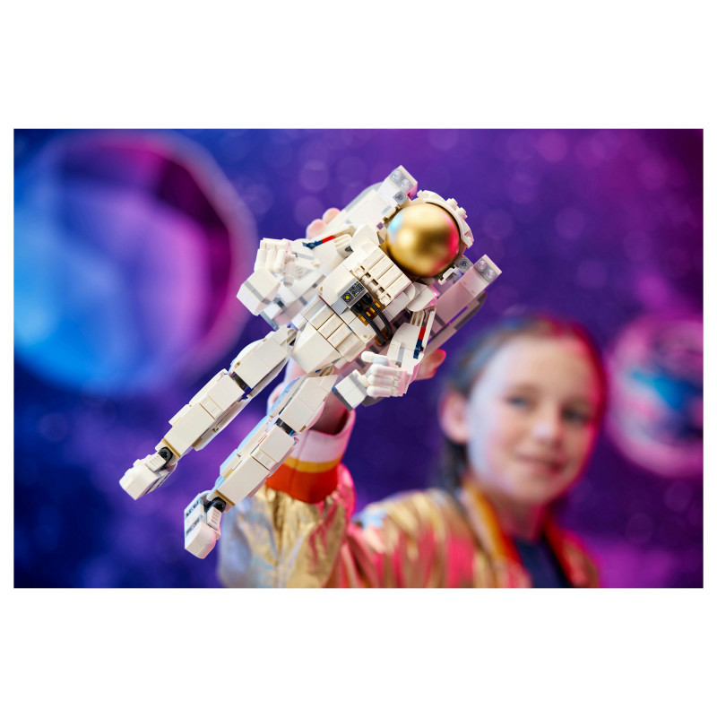 "LEGO Creator Space Astronaut. Product type: Building set, Recommended age (min): 9 yr(s), Material: Plastic, Number of pieces: 647 pc(s). Package weight: 942 g"\n"LEGO® fans aged 9+ can blast into space to explore new planets by recreating space adventures with this LEGO Creator Space Astronaut (31152) building toy. The astronaut figure includes a detachable jet propulsion backpack, posable legs, feet, arms and fingers and a golden opening visor with a seat inside for a minifigure (not included).