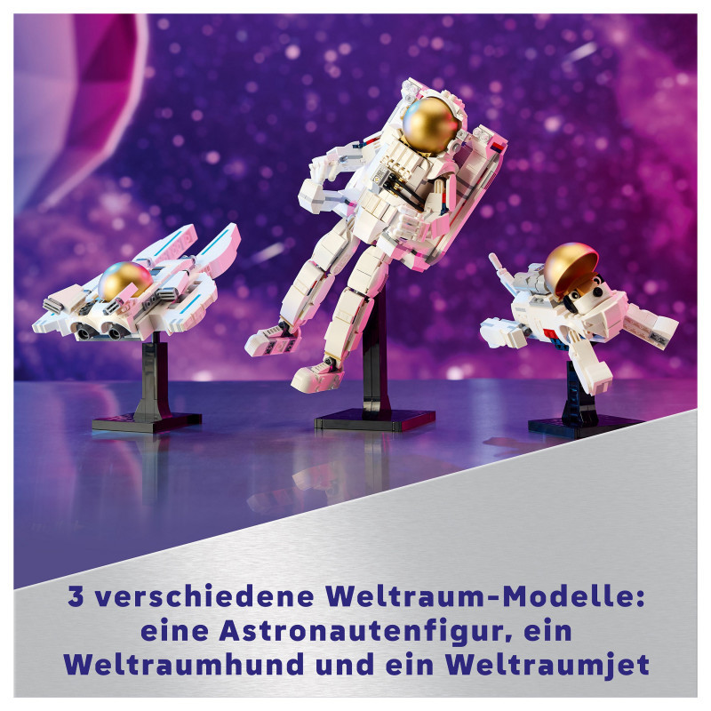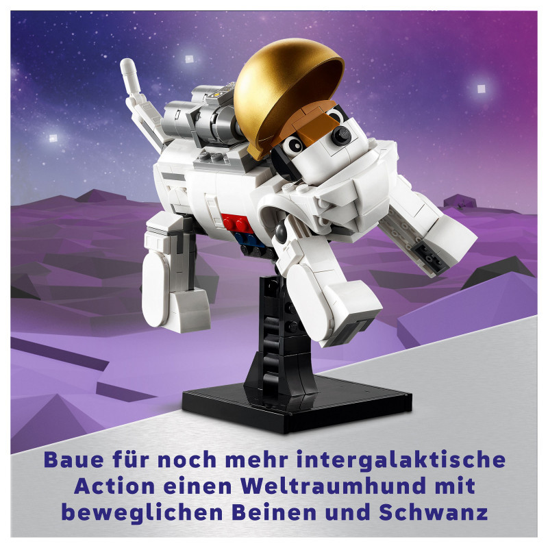 Boys and girls can build 3 different space playsets: a posable space astronaut, a futuristic space dog with posable legs and tail, or a space viper jet with a seat for a minifigure (not included) to pilot it. All 3 models make great space-themed creative gifts and come with stands for display.
