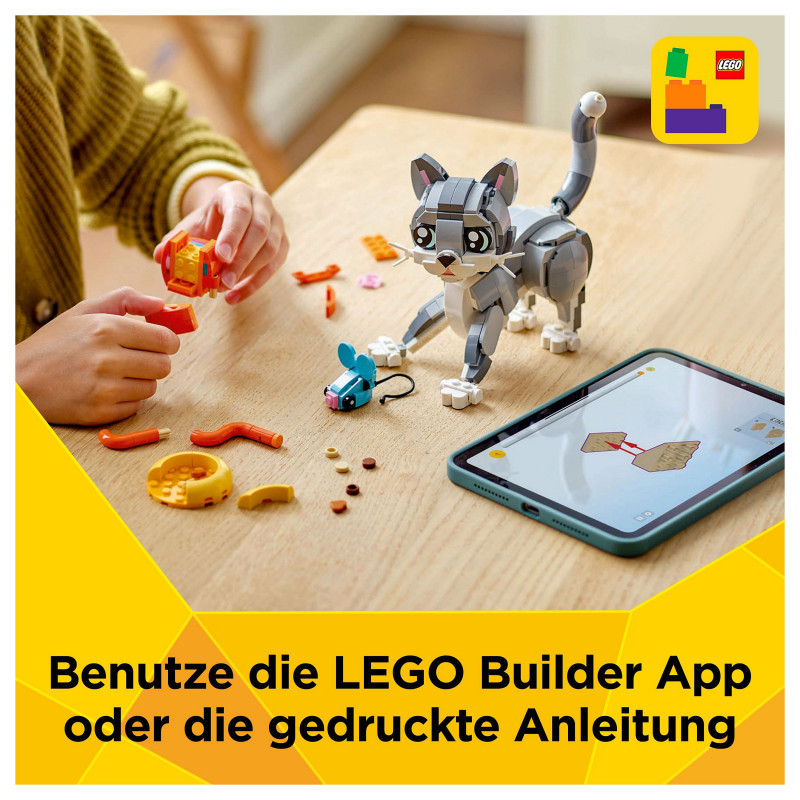 "LEGO Creator Playful Cat. Product type: Building set, Recommended age (min): 8 yr(s), Material: Plastic, Number of pieces: 407 pc(s). Package weight: 518 g"\n"Treat pet-lovers aged 8 and over with this adorable LEGO® Creator 3in1 Playful Cat (31163) building set. The pet toy set features a cute cat toy with a posable head, ears, tail and legs, and accessories including a food bowl, toy mouse and ball of yarn, so kids can play out fun-filled stories.