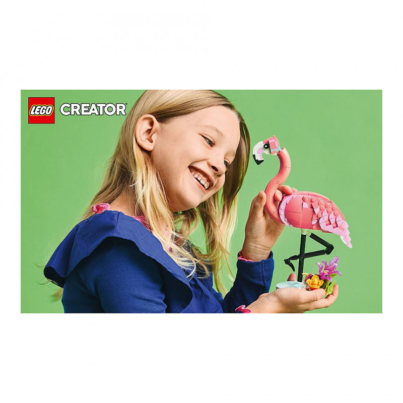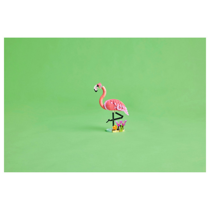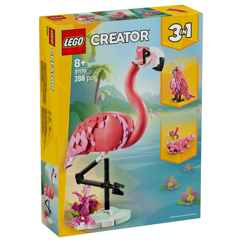 "LEGO Creator Wild Animals: Pink Flamingo. Product type: Building set, Recommended age (min): 8 yr(s), Material: Plastic, Number of pieces: 288 pc(s). Package weight: 420 g"\n"Delight animal-loving girls and boys aged 8 and over with this fantastic LEGO® Creator 3in1 Wild Animals: Pink Flamingo (31170) toy playset. The pink flamingo toy features a posable head and perches on a small plant-covered stand so kids can enjoy hours of imaginative play or display it as a piece of room decor.