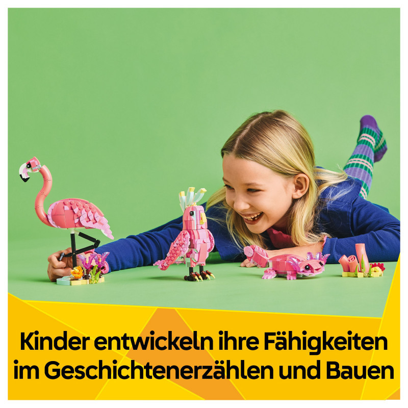 3 wild animal building options in 1 box – The LEGO® Creator 3in1 Wild Animals: Pink Flamingo toy set lets girls and boys aged 8 and over build and rebuild 3 different animal figures with the same bricks