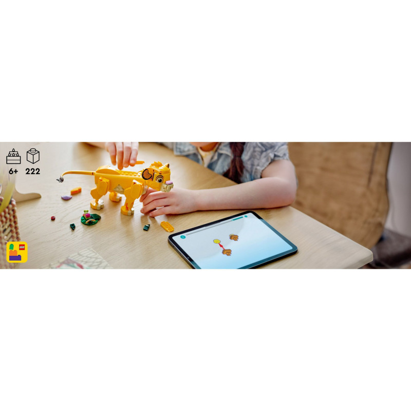 "LEGO Simba the Lion King Cub. Product type: Building set, Recommended age (min): 6 yr(s), Material: Plastic, Number of pieces: 222 pc(s). Package weight: 309 g"\n"Appeal to kids and The Lion King fans aged 6+ with this fun gift of a LEGO® ǀ Disney Simba the Lion King Cub (43243) play-and-display building toy, featuring a buildable character model that celebrates The Lion King’s 30th anniversary. The precocious baby Simba LEGO ǀ Disney animal figure from the hit film has a rotating head and movable legs and tail, and it comes with a leaf and 4 ‘bugs’ for ‘food’.