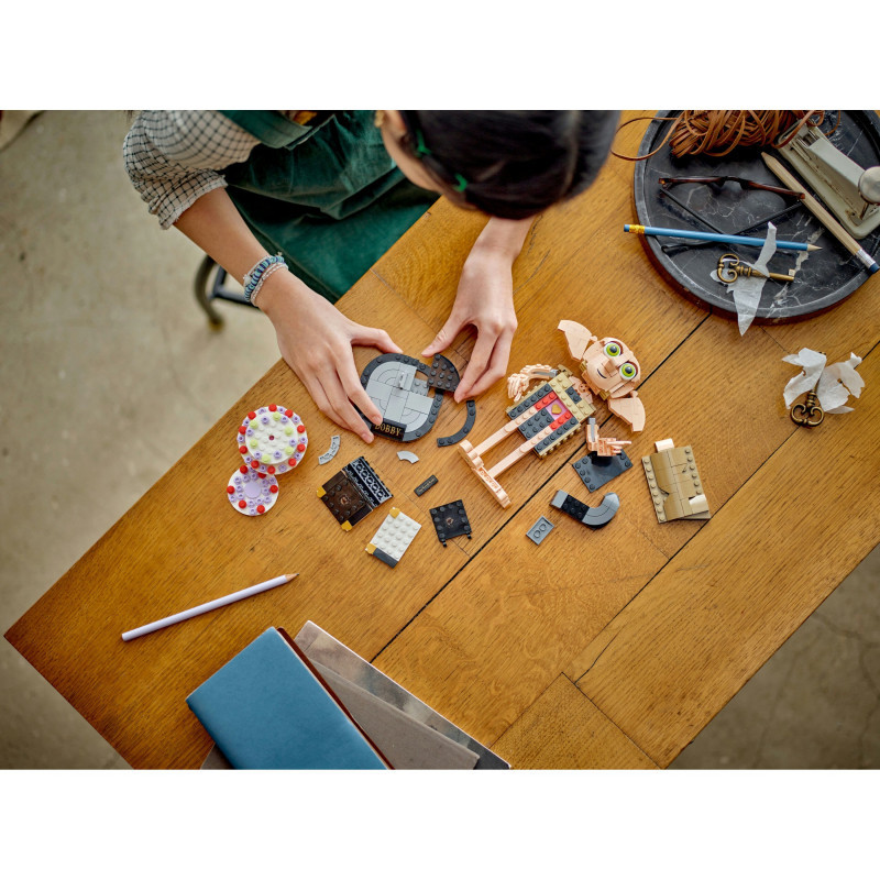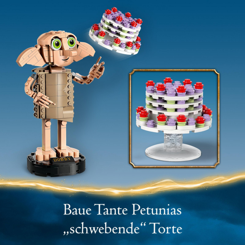 "LEGO Harry Potter Dobby™ the House-Elf. Product type: Building set, Recommended age (min): 8 yr(s), Material: Plastic, Number of pieces: 403 pc(s). Package weight: 451 g"\n"Delight Harry Potter™ fans with the first-ever LEGO® brick model of Dobby™ the House-Elf. The instantly recognisable brick-built figure has a posable head for different looks, and posable arms and fingers so Dobby can hold the included iconic accessories. There is a detailed buildable model of Harry Potter’s sock with Tom Riddle’s diary that Harry used to set Dobby free and Aunt Petunia’s ‘floating’ pudding cake to inspire memories of classic scenes.