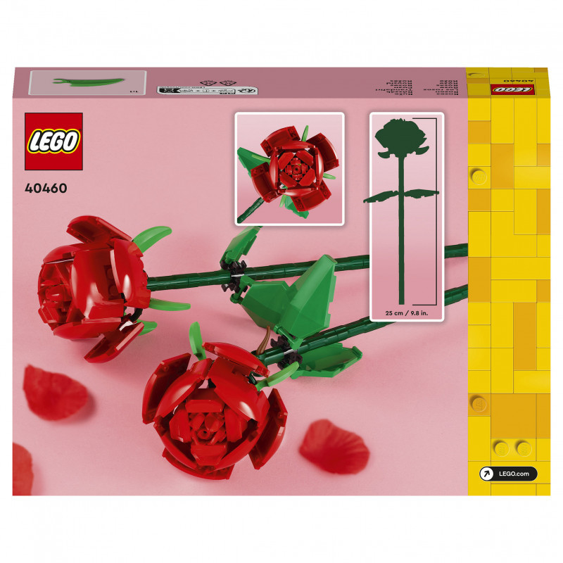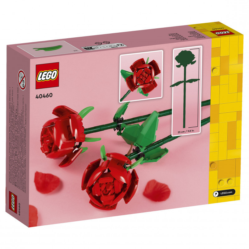 "LEGO Botanicals Roses. Product type: Building set, Recommended age (min): 8 yr(s), Material: Plastic, Number of pieces: 120 pc(s). Package weight: 161 g"\n"Mark a special occasion with these LEGO® Roses (40460). They’re the perfect gift for Valentine’s Day, Mother’s Day or just to let someone know how much they’re cherished – and they’ll bring a beautiful burst of colour when displayed in a vase. This easy-to-assemble set comes with 2 red blooms, green leaves and length-adjustable stems. Combine with LEGO Tulips (40461) to add extra colour to this brick-built bouquet. The set is also compatible with the LEGO Flower Bouquet (10280).