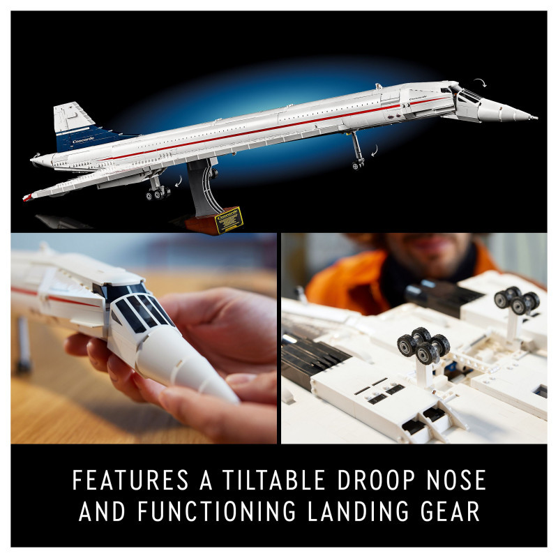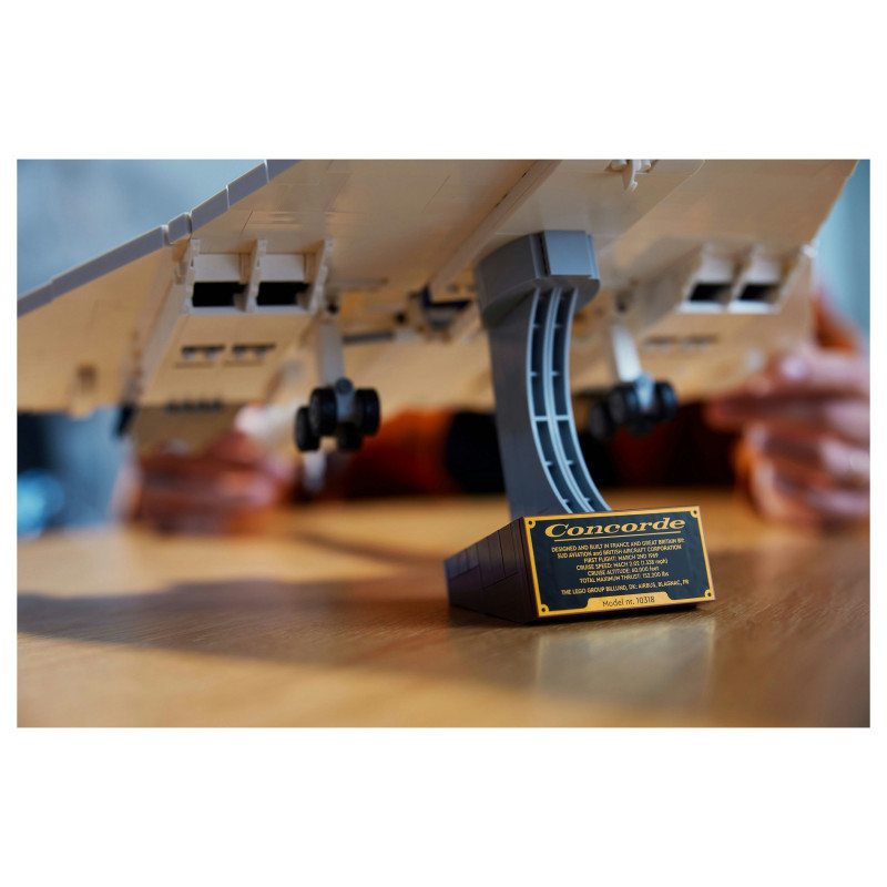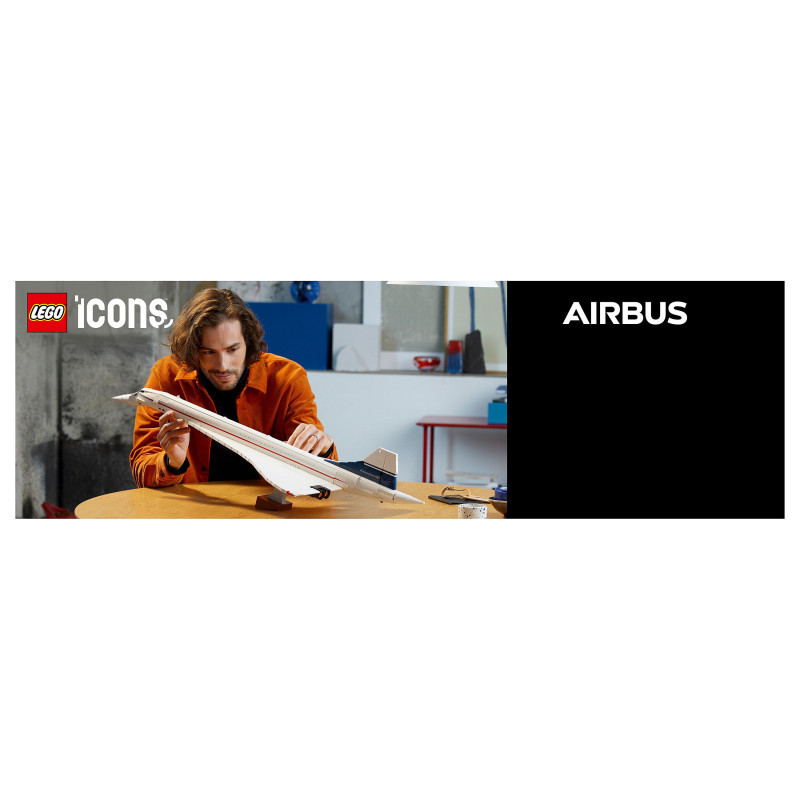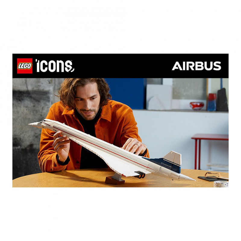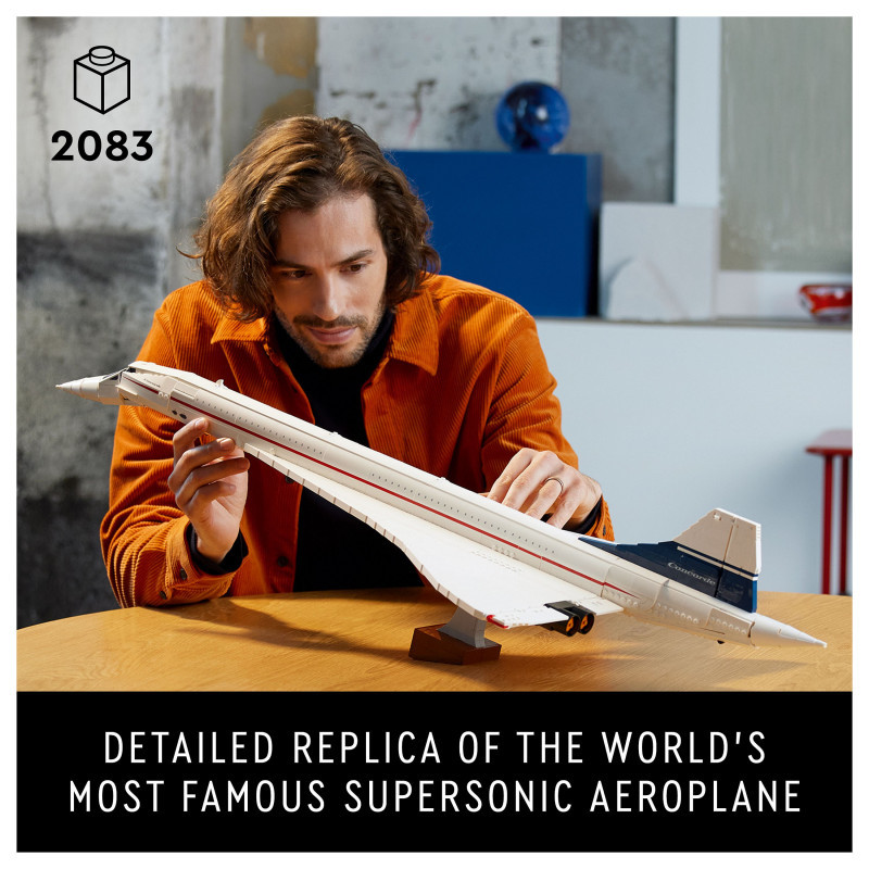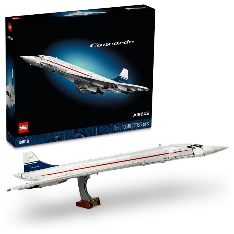 "LEGO ICONS Concorde. Product type: Building set, Recommended age (min): 18 yr(s), Material: Plastic, Number of pieces: 2083 pc(s). Package weight: 3.37 kg"\n"Embark on a supersonic journey with the LEGO® Icons Concorde (10318) model building set for adults. Take time out for a mindful building experience as you craft a detailed replica model of the world’s most famous supersonic commercial passenger aeroplane.