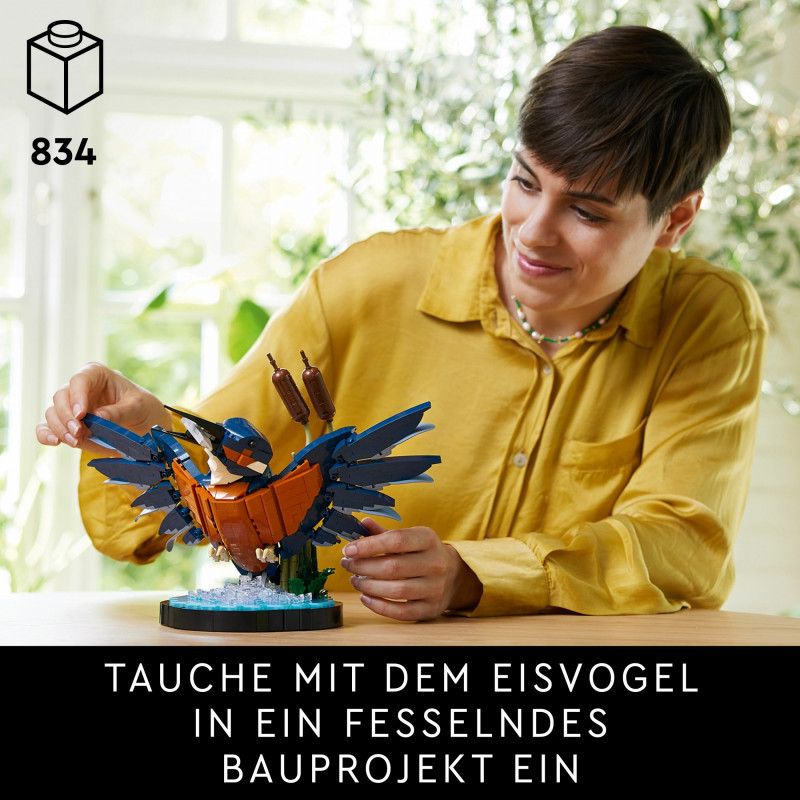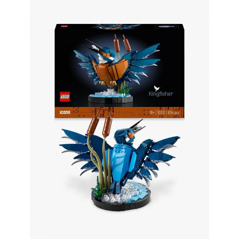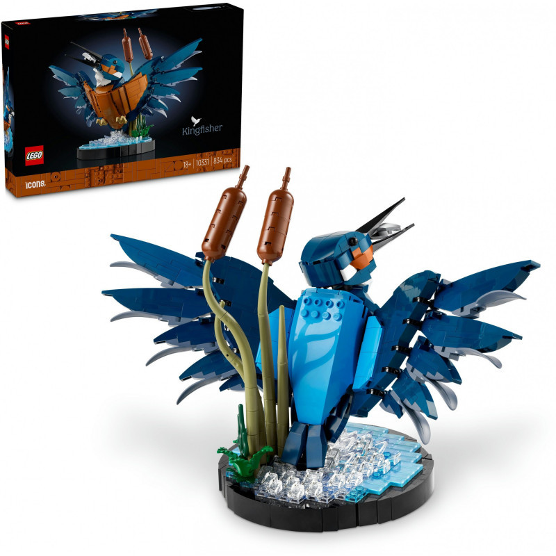 "LEGO Kingfisher Bird. Product type: Building set, Recommended age (min): 18 yr(s), Material: Plastic, Number of pieces: 834 pc(s). Package weight: 820 g"\n"Create a striking centrepiece for your home or office with this home decor building set for adults. This LEGO® Icons Kingfisher Bird set (10331) makes a great gift for bird-lovers and an immersive project for new and accomplished LEGO builders.