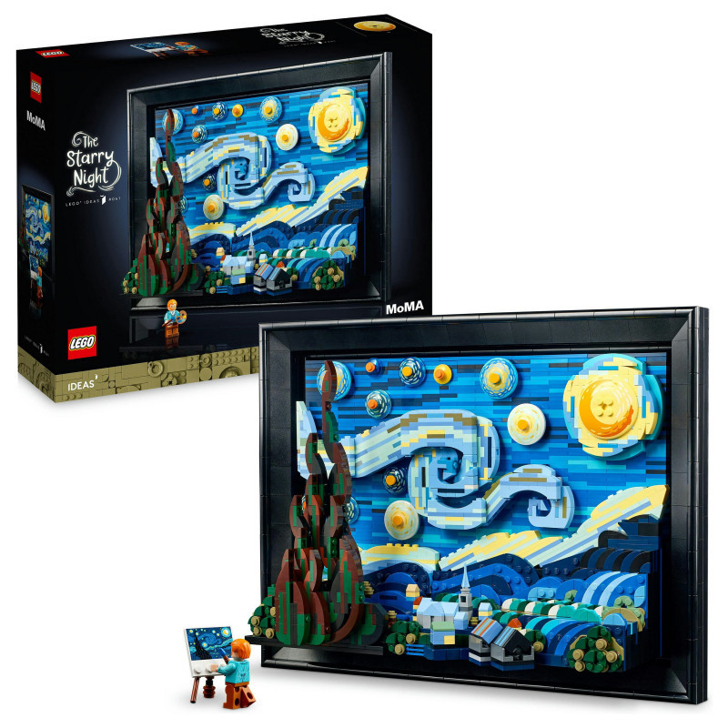 "LEGO Ideas Vincent van Gogh - The Starry Night. Product type: Building set, Recommended age (min): 18 yr(s), Material: Plastic, Number of pieces: 2316 pc(s). Package weight: 2.99 kg"\n"Build creativity. Build concentration. Build your own 3D LEGO® brick version of one of Vincent van Gogh’s most celebrated artworks, The Starry Night, which can be seen at The Museum of Modern Art (MoMA) in New York City. Discover innovative building techniques to capture Van Gogh’s swirling brushstrokes, and hang your completed masterpiece by the hook on a wall or display it freestanding. This wonderfully detailed LEGO Ideas model (21333) comes with an adjustable display arm on which the Vincent van Gogh minifigure can stand with his paintbrush, palette and easel.