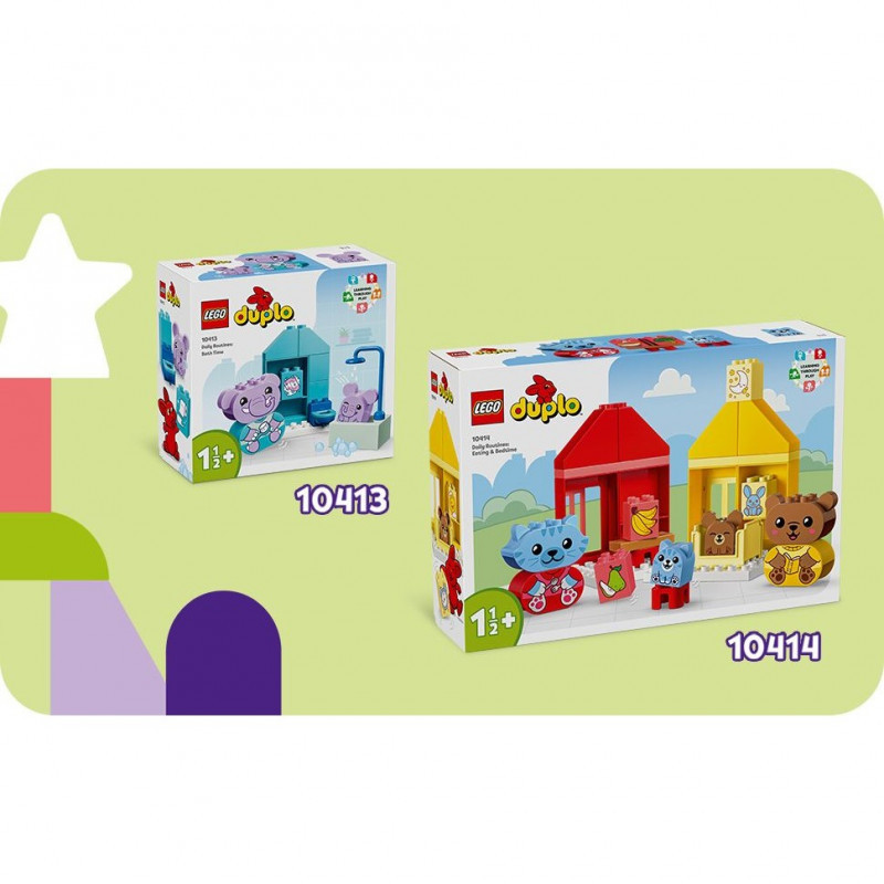 "LEGO DUPLO Daily Routines: Eating & Bedtime. Product type: Building set, Recommended age (min): 1.5 yr(s), Material: Plastic, Number of pieces: 28 pc(s). Package weight: 740 g"\n"Help toddlers explore their feelings with the LEGO® DUPLO® My First Daily Routines: Eating & Bedtime (10414) toy. This fun, hands-on toy for kids aged 18 months and over comes with 4 relatable animal toys.