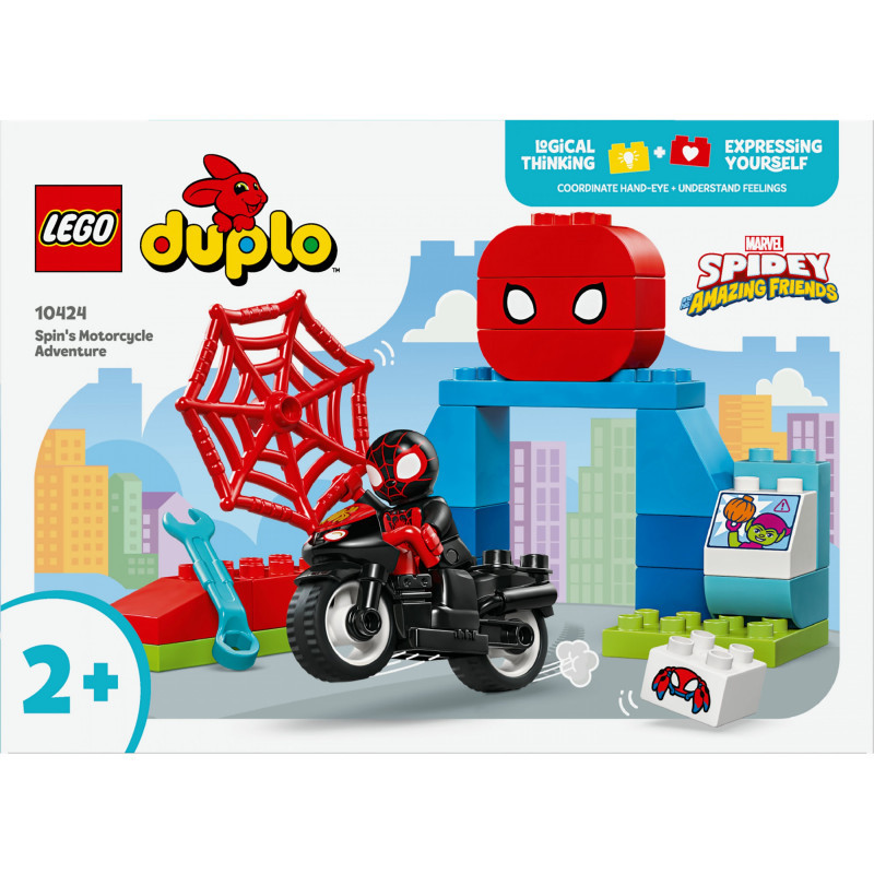 "LEGO Spin's Motorcycle Adventure. Product type: Building set, Recommended age (min): 2 yr(s), Material: Plastic, Number of pieces: 24 pc(s). Package weight: 370 g"\n"Toddlers buckle up for some Super Hero action with this LEGO® DUPLO® Marvel Spin’s Motorcycle Adventure (10424) Spidey playset. This preschoolers' learning toy lets little webslingers aged 2+ swing in to save the day as they recreate scenes inspired by the Disney+ TV show Spidey and His Amazing Friends.