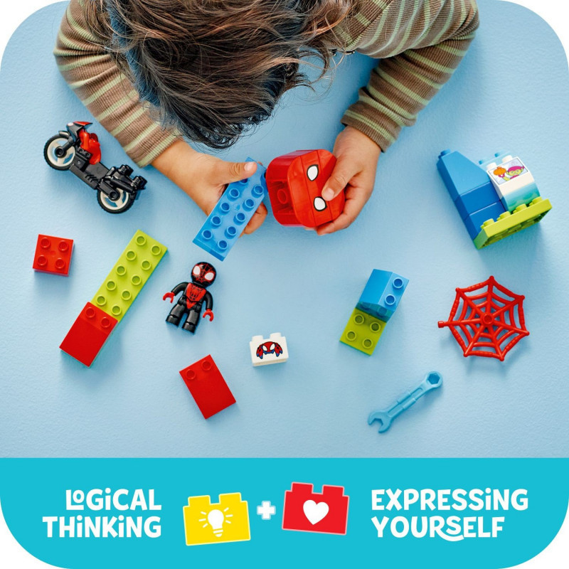 Creative toy packed with play starters – Includes a LEGO® DUPLO® Spin figure, a drivable motorbike toy, a build-and-rebuild toy HQ and ramp, a web element and a Trace-E robot spider brick