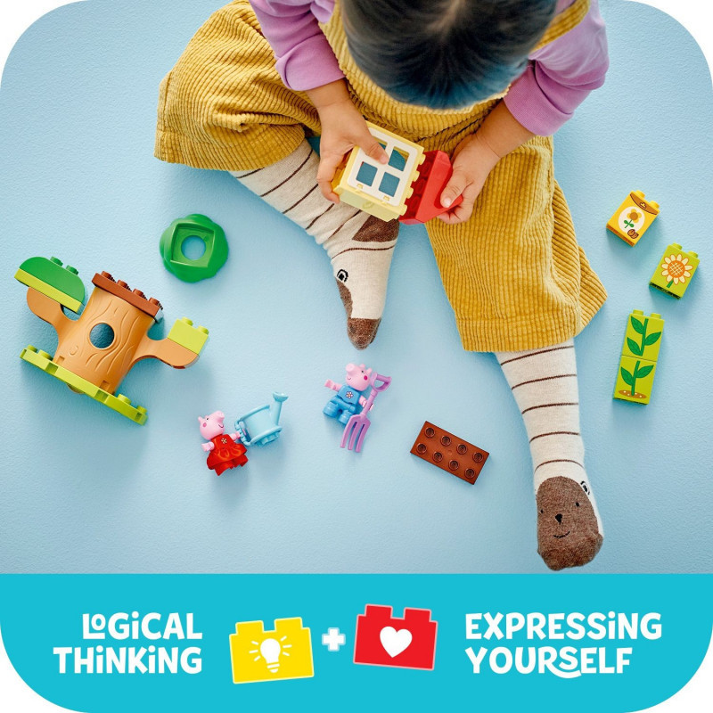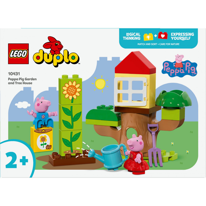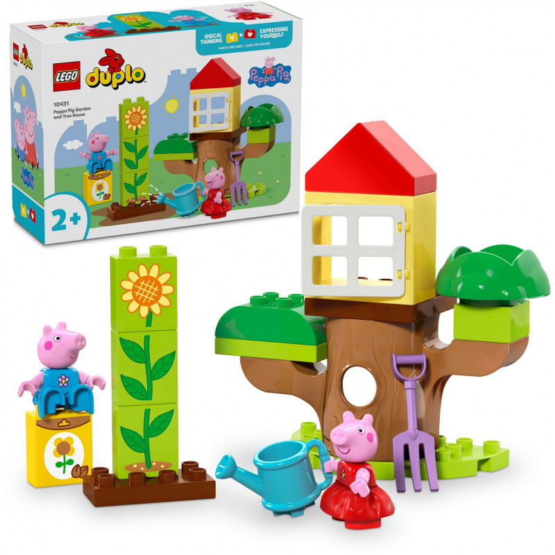 "LEGO Peppa Pig Garden and Tree House. Product type: Building set, Recommended age (min): 2 yr(s), Material: Plastic, Number of pieces: 20 pc(s). Package weight: 357 g"\n"Encourage toddlers aged 2+ to embrace the outdoors with the LEGO® DUPLO® Peppa Pig Garden and Tree House (10431) set. This fun toy nurtures preschool girls’ and boys’ love of nature as they role-play a day in the garden helping Peppa and George grow a sunflower.