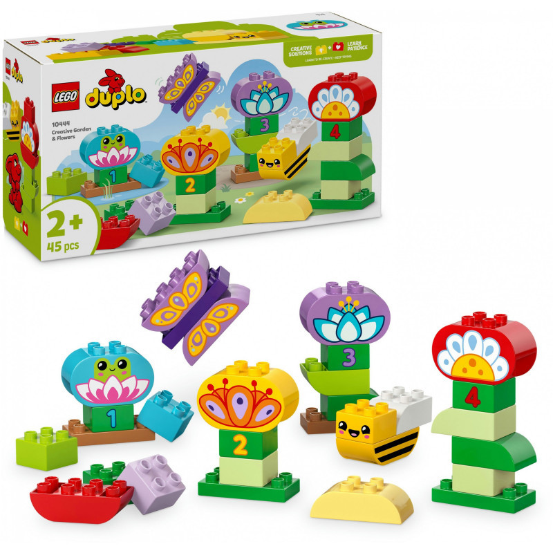 "LEGO Creative Garden & Flowers. Product type: Building set, Recommended age (min): 2 yr(s), Material: Plastic, Number of pieces: 45 pc(s). Package weight: 652 g"\n"Help your toddler’s creative and fine motor skills blossom with the LEGO® DUPLO® Town Creative Garden & Flowers (10444) stacking toy. With 45 bricks to build colourful flowers and cute LEGO DUPLO animal and insect toys, this building set inspires creative kids to construct a brick-built scene of ever-changing beauty.