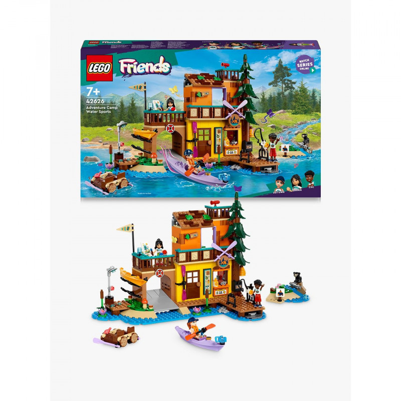 "LEGO Adventure Camp Water Sports. Product type: Building set, Recommended age (min): 7 yr(s), Material: Plastic, Number of pieces: 628 pc(s). Package weight: 1.11 kg"\n"This building toy set makes a great birthday gift idea for kids aged 7+ who love role play and outdoor adventures. Girls and boys can create their own friendship stories as they explore the LEGO® Friends Adventure Camp Water Sports (42626) toy and try out all the different activities: from kayaking, fishing and raft building to painting and skipping stones. The set comes with 3 LEGO Friends minidolls, a bear figure and lots of water sports accessories.
