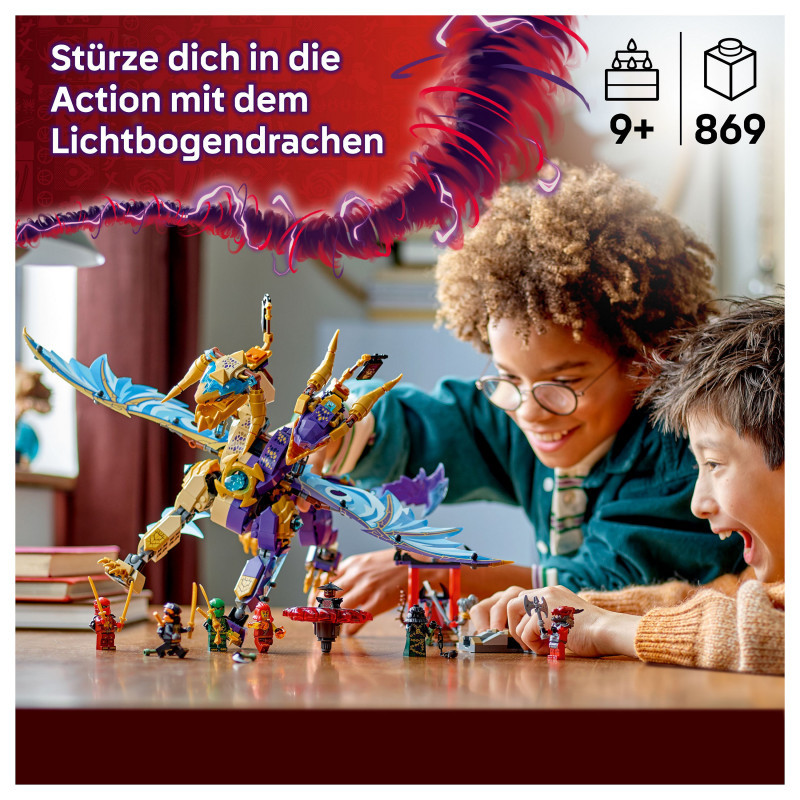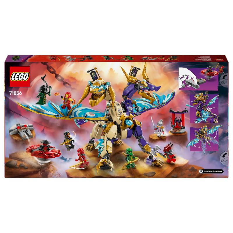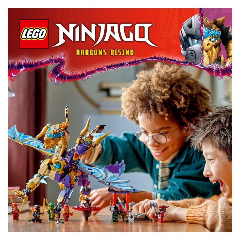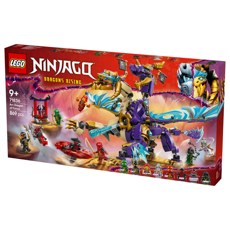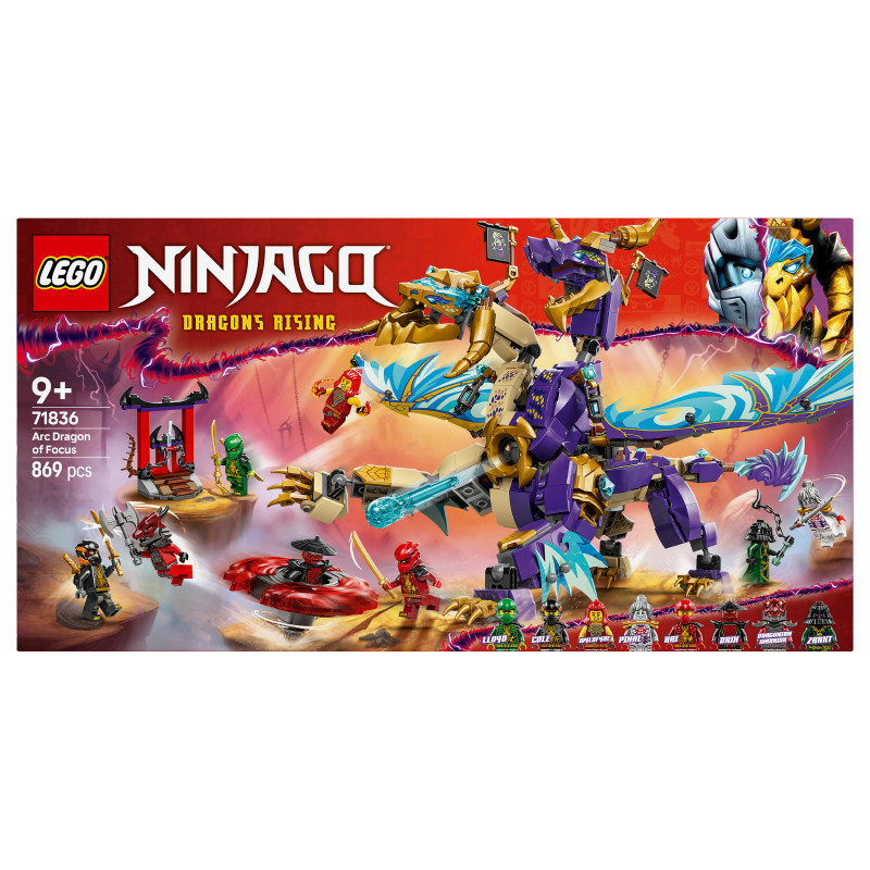 "LEGO NINJAGO Arc Dragon of Focus. Product type: Building set, Recommended age (min): 9 yr(s), Material: Plastic, Number of pieces: 869 pc(s). Package weight: 1.21 kg"\n"Delight boys and girls aged 9 and over with this LEGO® NINJAGO® Arc Dragon of Focus (71836) ninja toy that lets them role-play epic action scenes from season 3 of the NINJAGO Dragons Rising TV show. This building kit features a 2-headed dragon figure with posable tail, legs, feet, head, neck, jaw and claws. Kids can activate a shooter in its chest and move its large foil wings back and forth using a lever on its back.