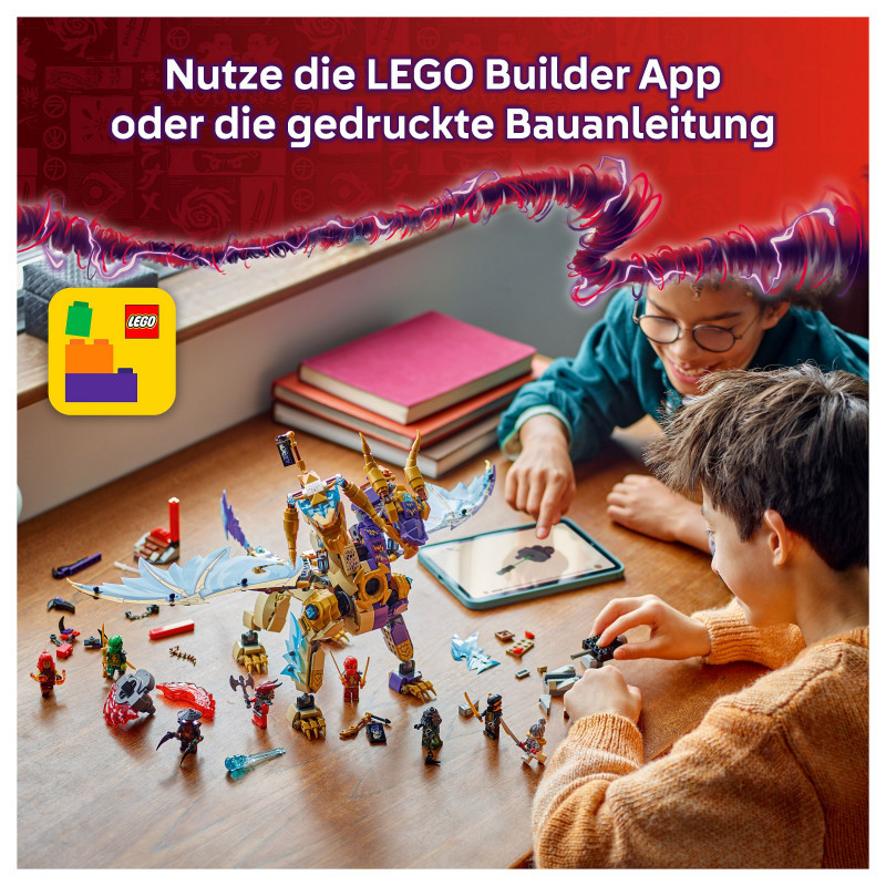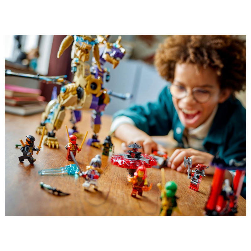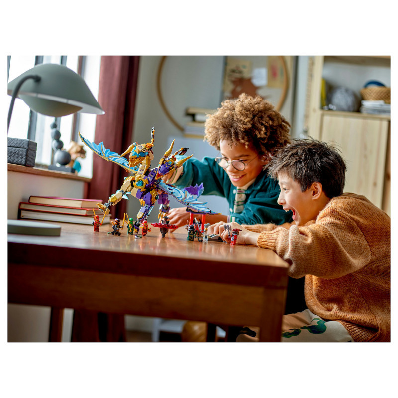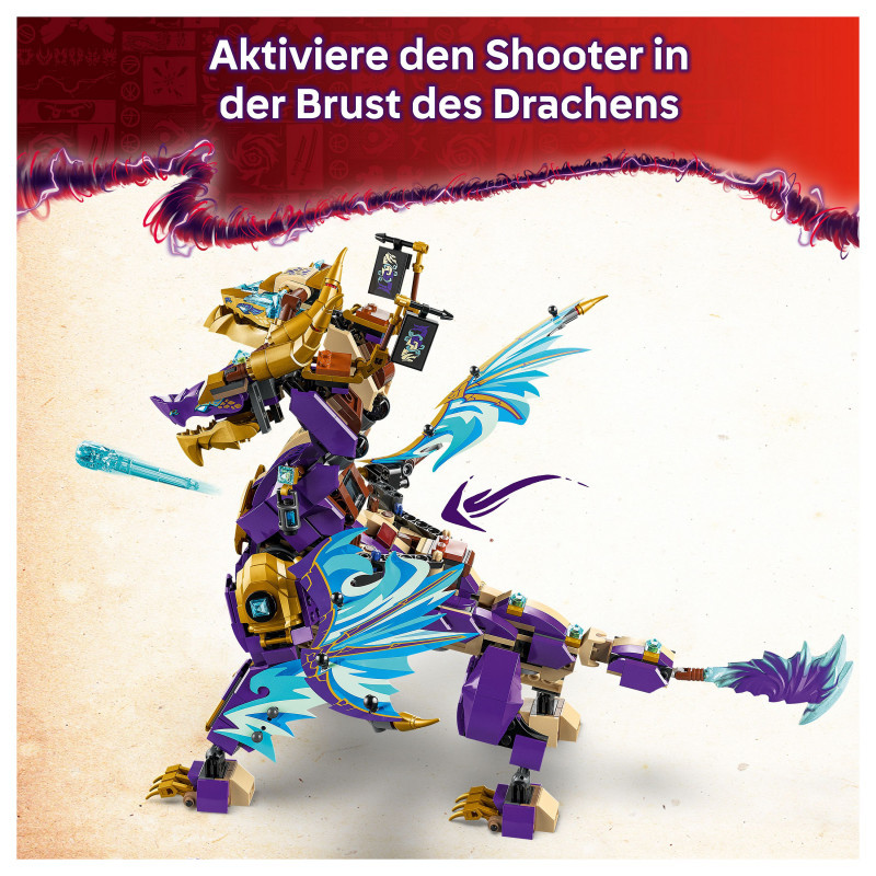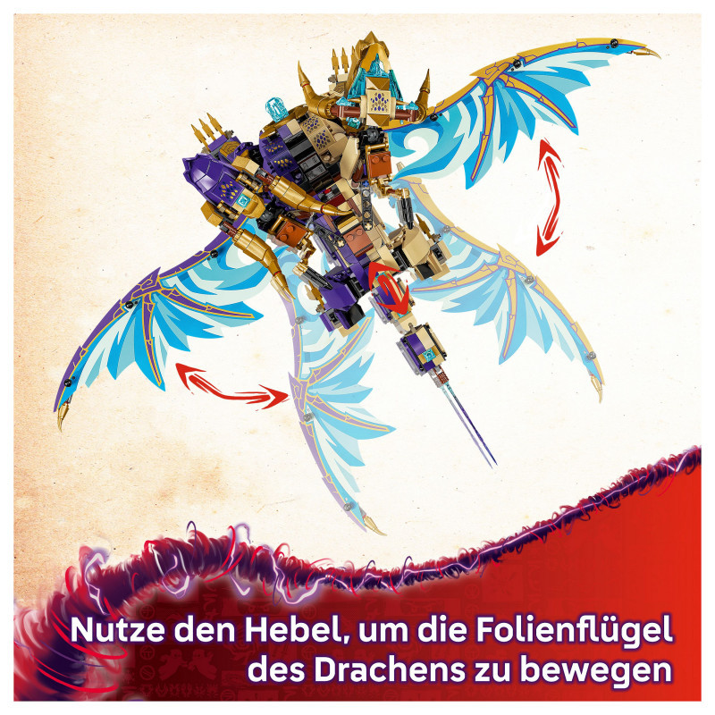 Interactive NINJAGO® dragon – Kids can activate a shooter in the dragon’s chest and move its large foil wings back and forth using a lever on its back