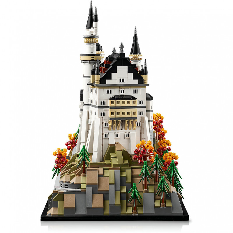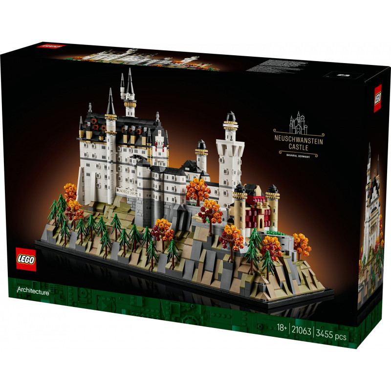 "LEGO Architecture Neuschwanstein Castle. Product type: Building set, Recommended age (min): 18 yr(s), Material: Plastic, Number of pieces: 3455 pc(s). Package weight: 3.57 kg"\n"Dive into your passion for iconic landmarks with this collectible 3,455-piece LEGO® Architecture Neuschwanstein Castle (21063) building set for adults. Spend quality time building a display piece that also makes a great architectural gift for you or other history lovers. The build is full of surprises, from the exterior spires, turrets, courtyard, staircases and gabled roofs to the small interior builds. Plus, the foliage of the surrounding trees can be changed to depict a summer or autumn landscape. Serenity awaits as you build this detailed LEGO castle set.