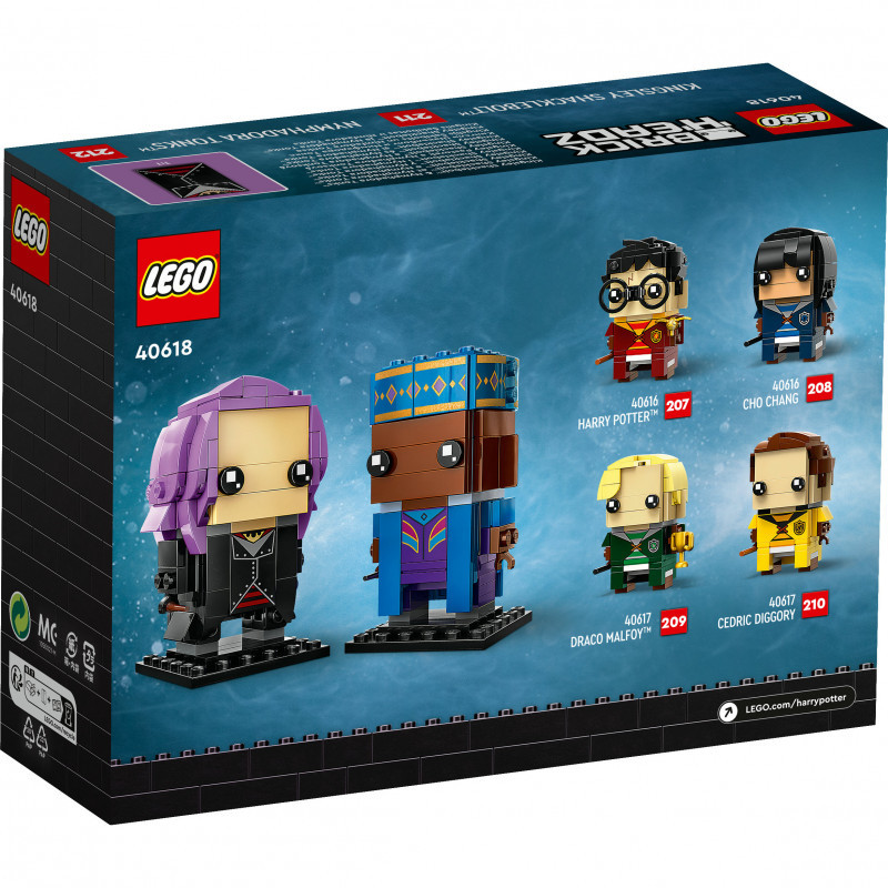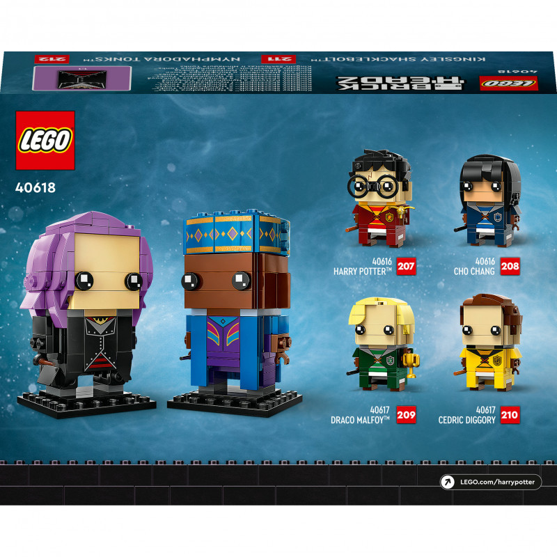 "LEGO Harry Potter 40618. Product type: Building set, Recommended age (min): 10 yr(s), Material: Plastic, Number of pieces: 250 pc(s). Package weight: 253 g"\n"Fans can relive Harry Potter and the Order of the Phoenix™ scenes as they build these colorful LEGO® Harry Potter™ Kingsley Shacklebolt™ & Nymphadora Tonks™ figures (40618). The look of these popular characters, from Nymphadora’s bright pink hair to Kingsley’s stylish headgear, is cleverly captured in LEGO BrickHeadz™ style. This LEGO set is suitable for ages 10 and up and makes a fun anytime gift for Harry Potter fans and collectors."