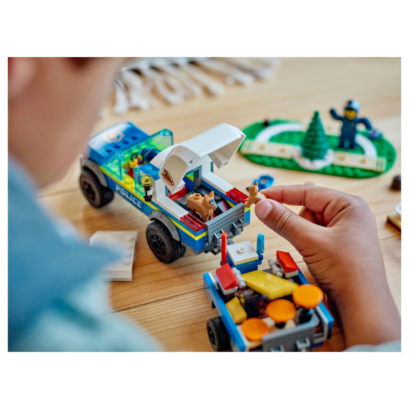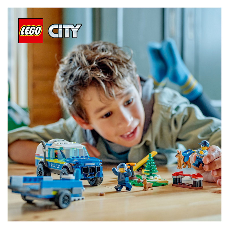 What’s in the box? – Everything kids need to build a toy police K9 SUV, trailer, 3 dog training apparatus and a training ground setting, plus 2 minifigures, a dog figure and a puppy figure