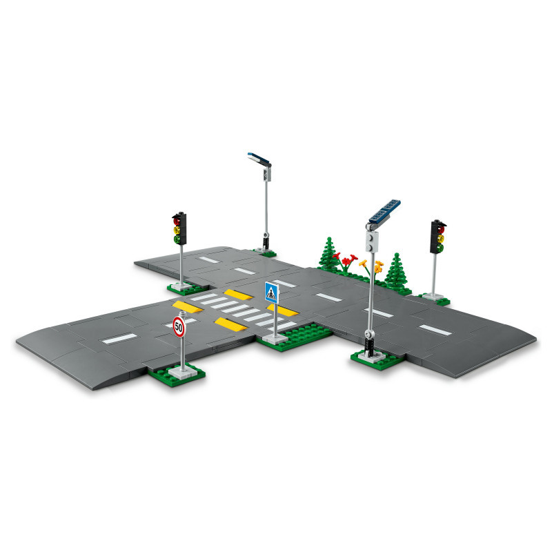 What’s in the box? Kids get 5 LEGO® Road Plates featuring traffic lane markings, speed bumps and a pedestrian crossing, plus glow-in-the-dark streetlights, toy traffic lights, road signs, trees and greenery.