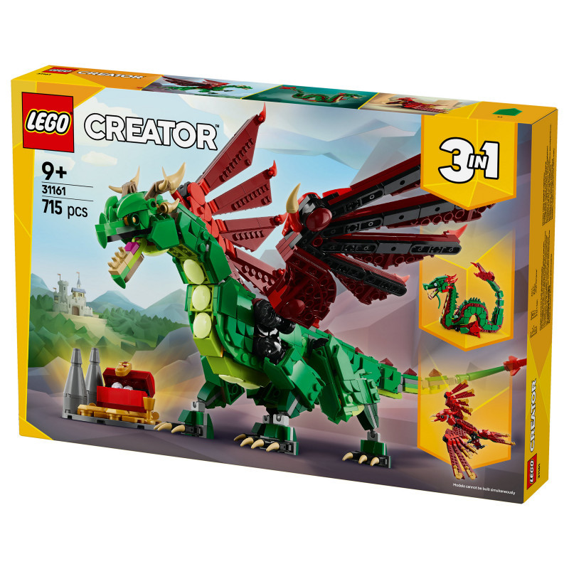 "LEGO Creator Medieval Dragon. Product type: Building set, Recommended age (min): 9 yr(s), Material: Plastic, Number of pieces: 715 pc(s). Package weight: 944 g"\n"Delight your little time traveller with this LEGO® Creator Medieval Dragon (31161) creature toy playset. Featuring a dragon figure that lets boys and girls aged 9 and over role-play thrilling medieval action, it has a pair of large posable wings that move up and down and fold in and out, as well as posable ankles, toes, neck, jaw, hips and shoulders. It also comes with a treasure chest for added play value.
