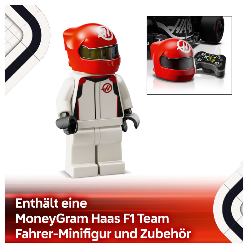 1 minifigure – The vehicle kit includes a driver minifigure wearing a MoneyGram Haas F1® Team outfit and a winged helmet for kids to place inside the cockpit and role-play thrilling race action