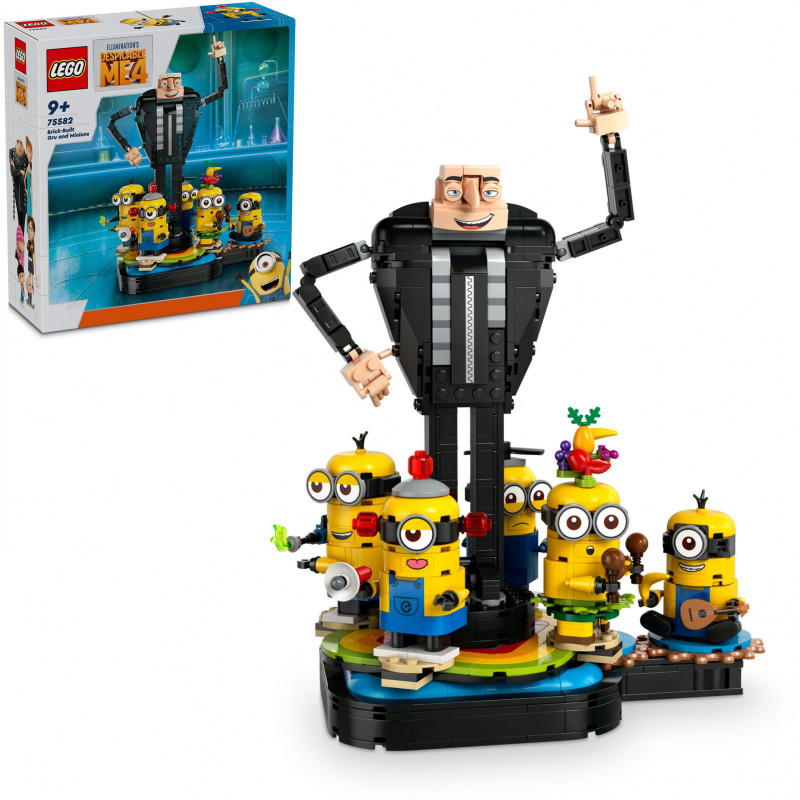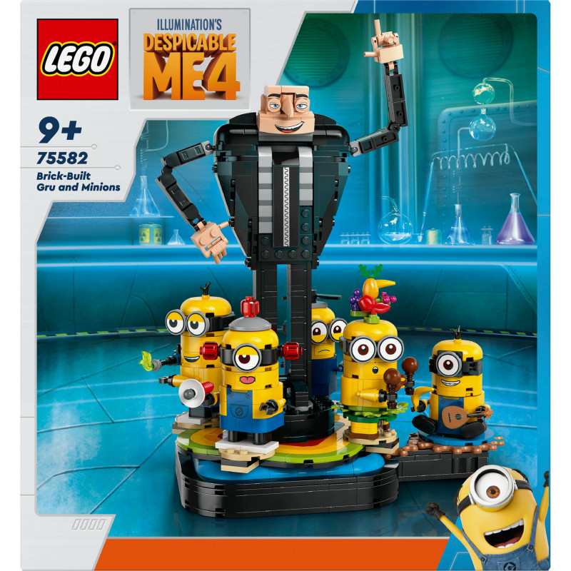"LEGO Alien Conquest Brick-Built Gru and Minions. Product type: Building set, Recommended age (min): 9 yr(s), Material: Plastic, Number of pieces: 839 pc(s). Package weight: 998 g"\n"Fulfil a child’s passion for Minion toys with LEGO® Despicable Me 4 Brick-Built Gru and Minions (75582). This creative building toy for kids aged 9+ features a buildable Gru figure surrounded by dancing Minion characters, making it the perfect play-and-display gift for kids and fans of the Despicable Me films.