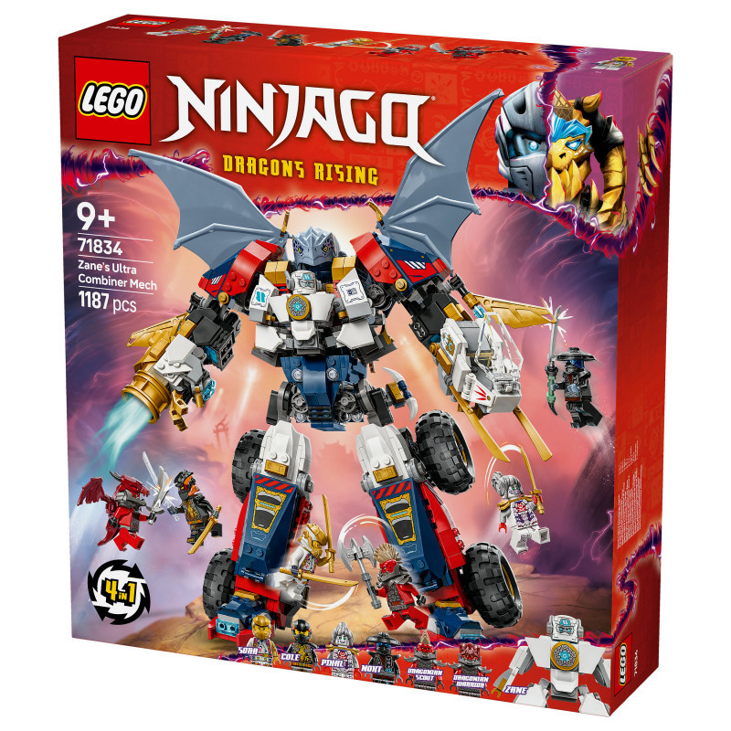 "LEGO NINJAGO Zane's Ultra Combiner Mech. Product type: Building set, Recommended age (min): 9 yr(s), Material: Plastic, Number of pieces: 1187 pc(s). Package weight: 1.54 kg"\n"Boys and girls aged 9 and over can enjoy endless play possibilities recreating exciting action from season 3 of the NINJAGO® Dragons Rising TV show with Zane’s Ultra Combiner Mech (71834) toy 4-in-1 building set.