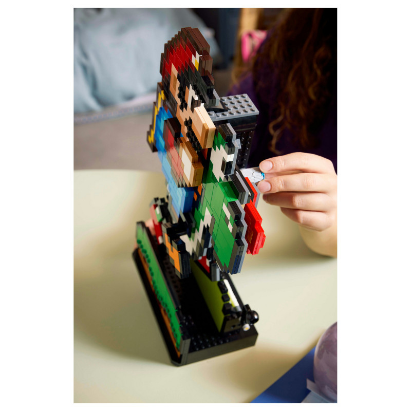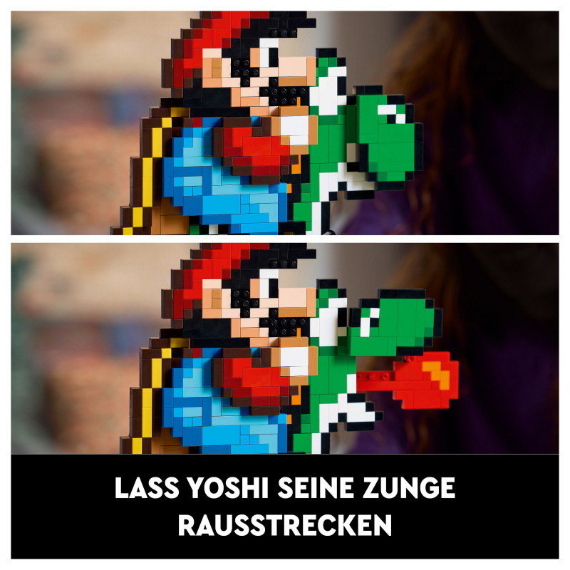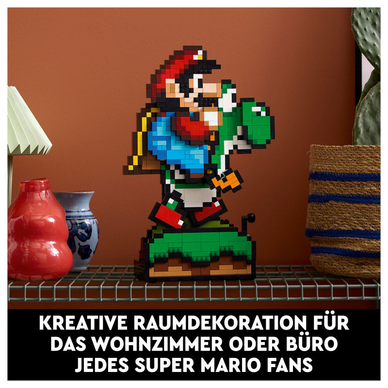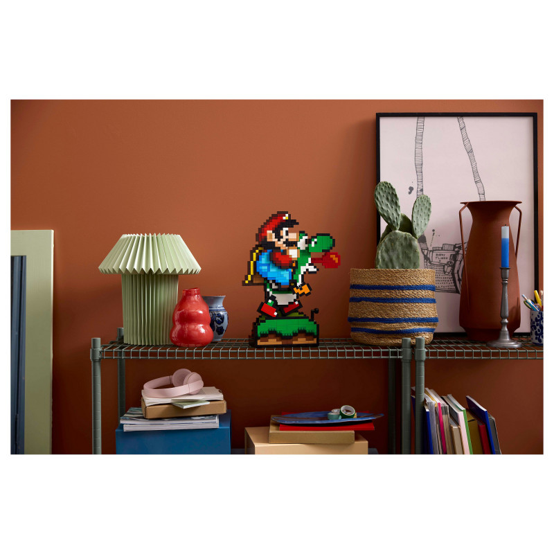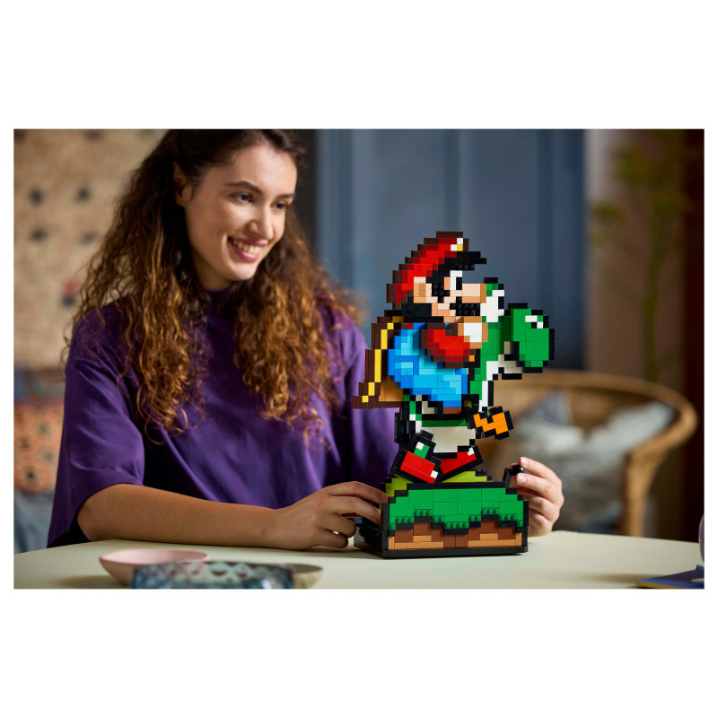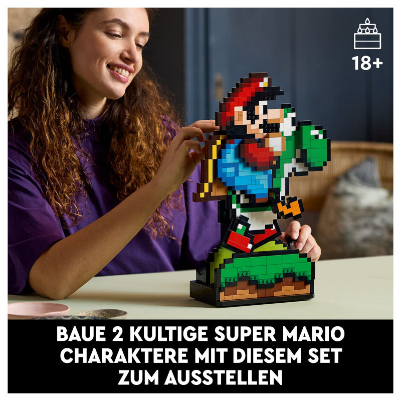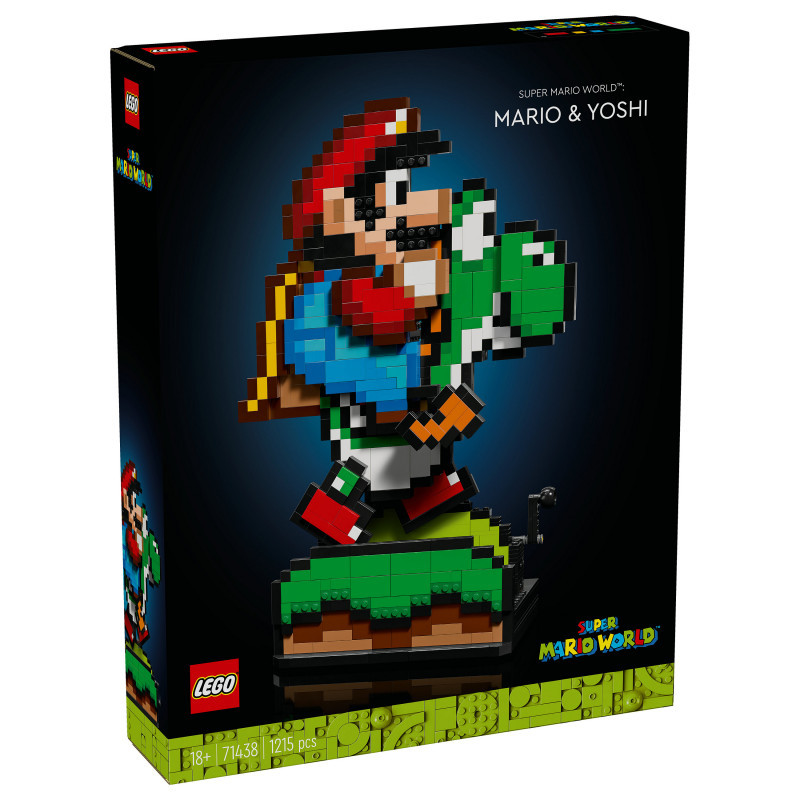 "LEGO Super Mario World™: Mario & Yoshi. Product type: Building set, Recommended age (min): 18 yr(s), Material: Plastic, Number of pieces: 1215 pc(s). Package weight: 2.02 kg"\n"Build nostalgia for the delightful visuals from an earlier generation of Super Mario™ games with this playful Super Mario World™: Mario & Yoshi display model. A fun LEGO® Super Mario™ gift for adults, this Nintendo® collectible set features pixelated Mario and Yoshi figures and makes fun room decor in any fan’s home or office. Turn the handle to make Yoshi run with Mario on his back and rotate the dial to make Yoshi’s tongue pop in and out.