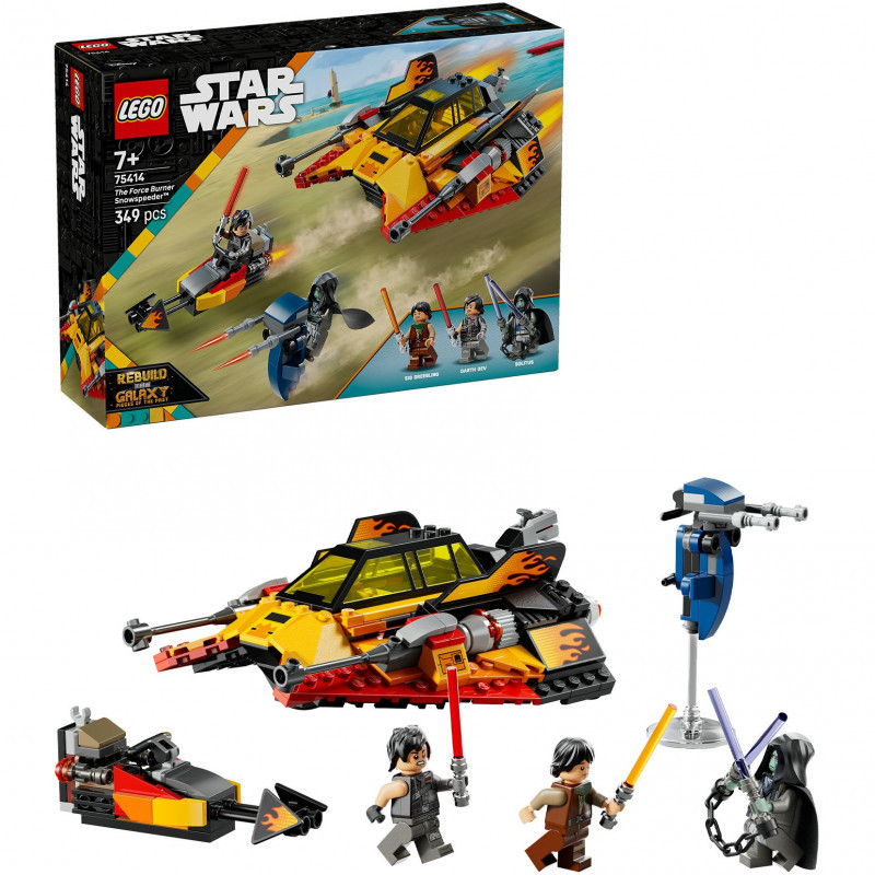 "LEGO Star Wars The Force Burner Snowspeeder™. Product type: Building set, Recommended age (min): 7 yr(s), Material: Plastic, Number of pieces: 349 pc(s)"\n"Gear up for fast action play with The Force Burner Snowspeeder (75414). A top Star Wars™ gift idea for boys, girls and any fans aged 7 and over, this collectible building toy for kids recreates authentic features of the unique snowspeeder vehicle seen in LEGO® Star Wars: Rebuild the Galaxy™ Season 2. It’s got eye-catching flame decals, an opening double cockpit with a hidden, detachable speeder bike, and a rear stud shooter. Press down on the seat in the back of the cockpit (or the head of the LEGO minifigure sitting in it) to release the speeder bike.