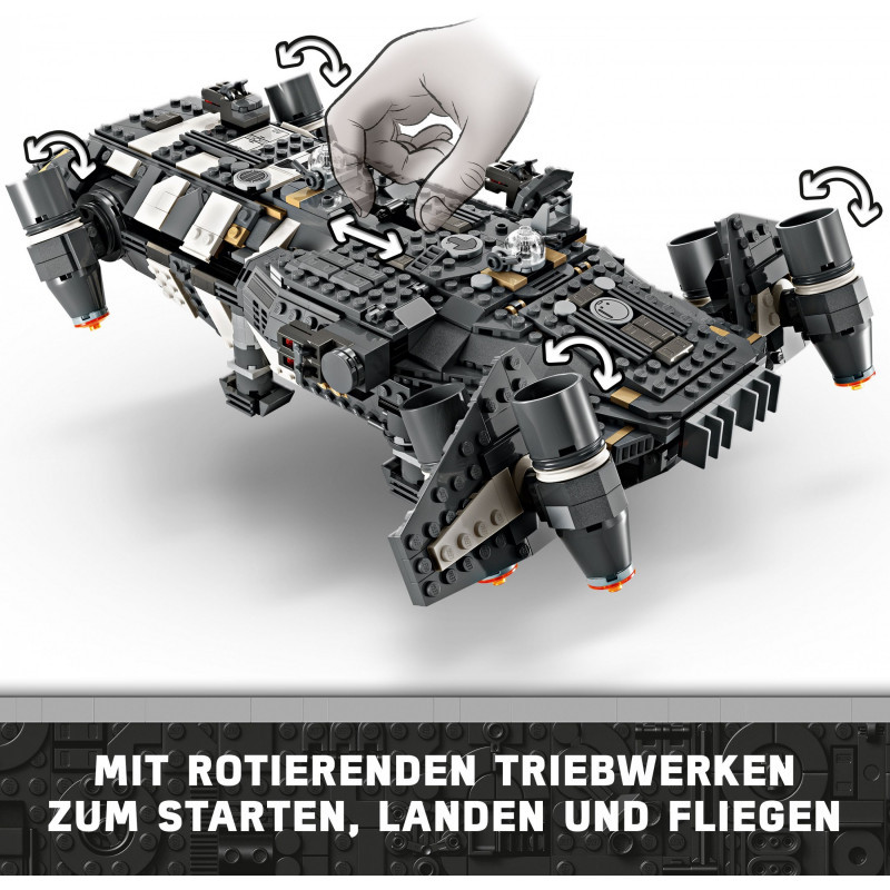 "LEGO Star Wars The Onyx Cinder. Product type: Building set, Recommended age (min): 10 yr(s), Material: Plastic, Number of pieces: 1325 pc(s). Package weight: 1.8 kg"\n"Kids become the heroes in their own Star Wars: Skeleton Crew stories with a detailed LEGO® brick recreation of The Onyx Cinder (75374). This collectible LEGO Star Wars™ buildable starship toy features rotating engines for landing/takeoff or flight, 2 stud shooters, 2 rotating turrets, each with 2 stud shooters, and a grabbing claw. It has seats for all 5 included LEGO Star Wars characters (the Jod LEGO minifigure in the cockpit and Wim, Fern, KB and Neel in the passenger compartment), plus storage for the 4 buildable torches and other cargo. There is also a kitchen table and a bed, plus accessory elements including fruit and a walkie-talkie to inspire creative play.