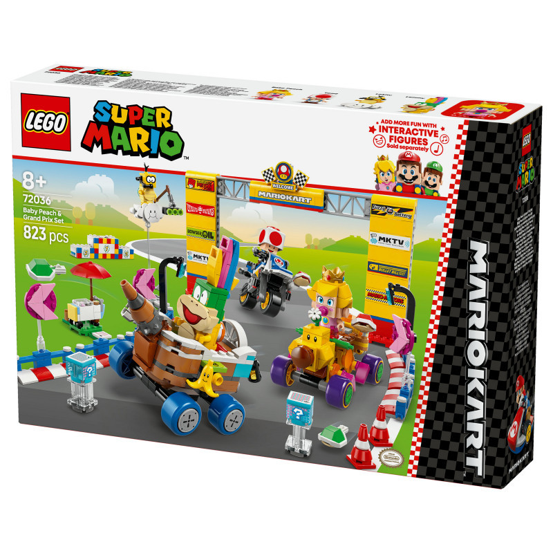 "LEGO Super Mario Mario Kart™ – Baby Peach & Grand Prix Set. Product type: Building set, Recommended age (min): 8 yr(s), Material: Plastic, Number of pieces: 823 pc(s). Package weight: 1.02 kg"\n"Ready, steady, build! Let kids create their own Mario Kart™ track and vehicles, race to victory and role-play as iconic characters with this LEGO® Super Mario™: Mario Kart: Baby Peach & Grand Prix Set (72036). An awesome Nintendo® character gift idea for boys, girls and gamers aged 8 and over, this customisable racing toy playset features Wild Wiggler, Landship and Standard Bike vehicles that can launch shells, a starting gate, track barriers, traffic cones, a winners’ podium, Toad’s sweets wagon and Lakitu’s cloud.