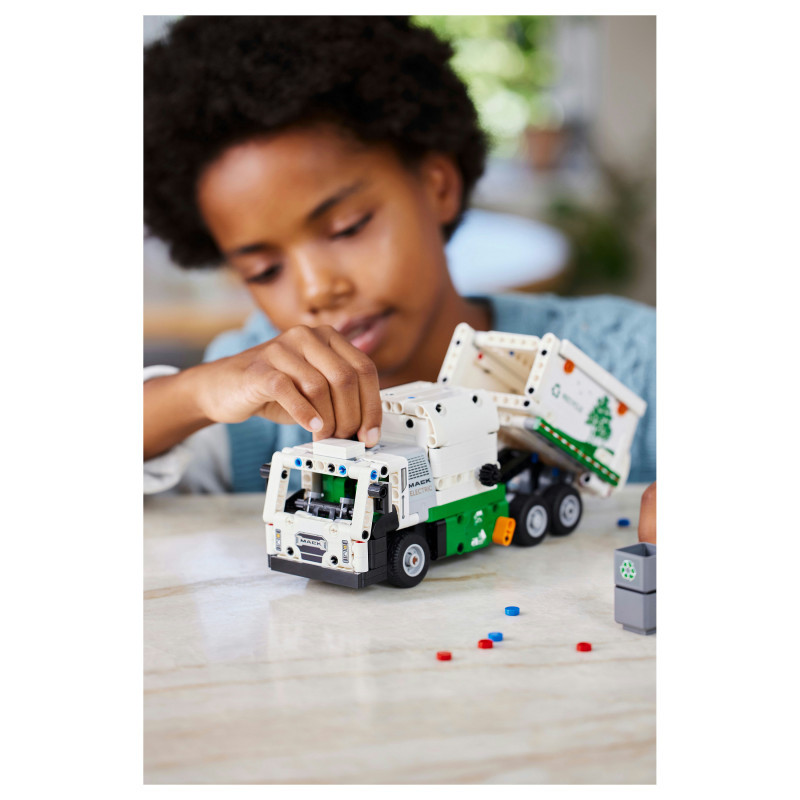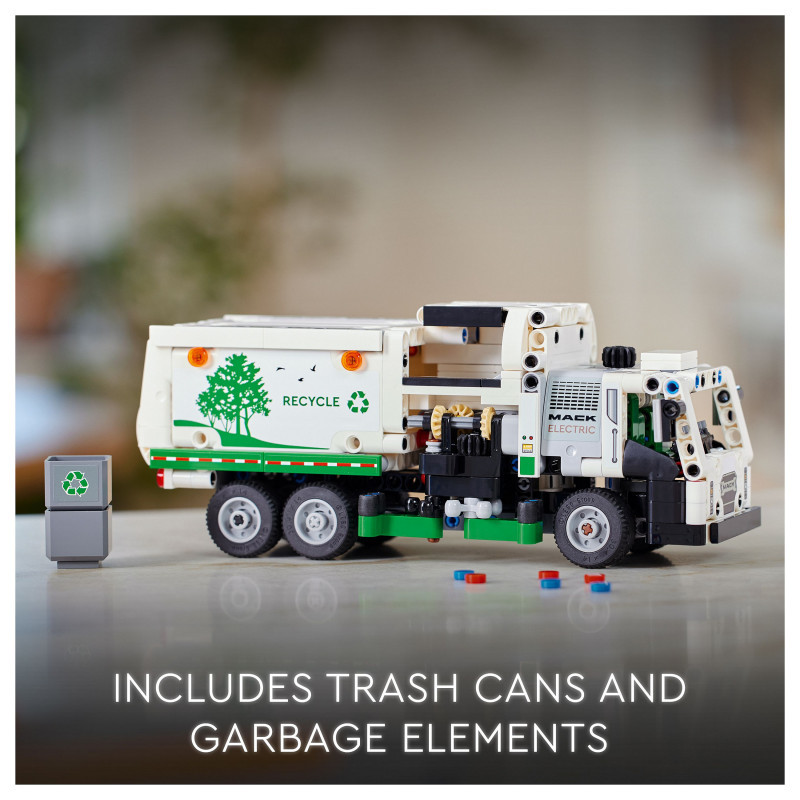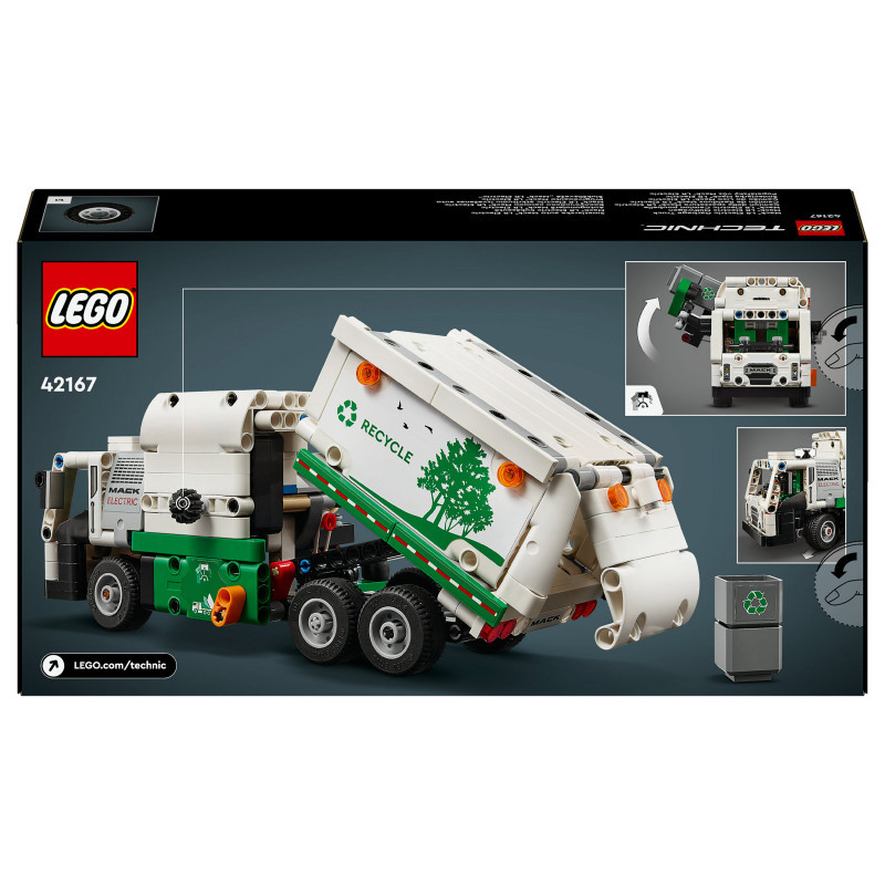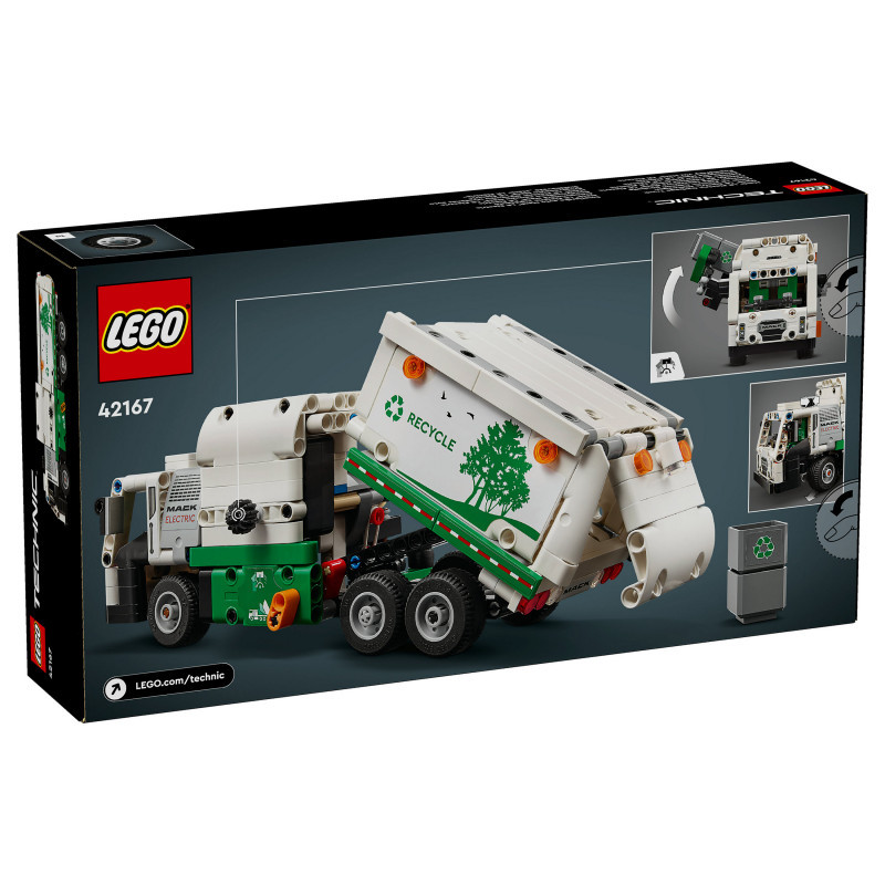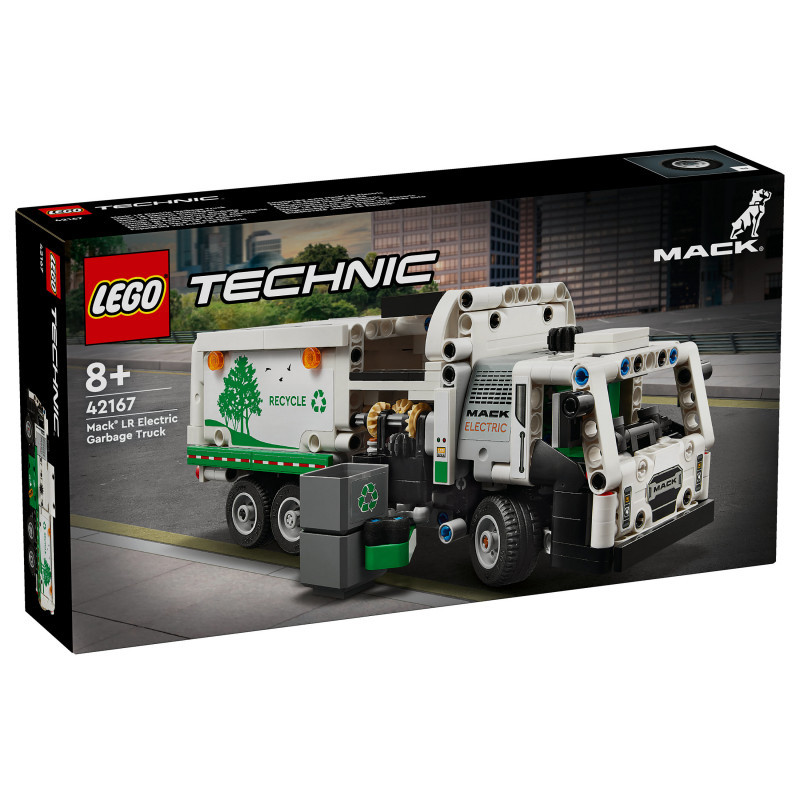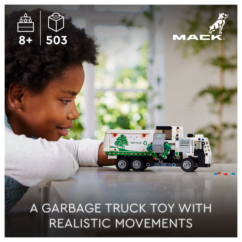 "LEGO Technic Mack® LR Electric Garbage Truck. Product type: Building set, Recommended age (min): 8 yr(s), Material: Plastic, Number of pieces: 503 pc(s). Package weight: 709 g"\n"Inspire kids who love vehicles to think about green energy and keeping the city clean with this LEGO® Technic Mack® LR Electric Garbage Truck toy (42167) for boys and girls aged 8+. This recycling truck toy is inspired by the cutting-edge Mack electric garbage truck and features realistic movement and features. Model not motorized.