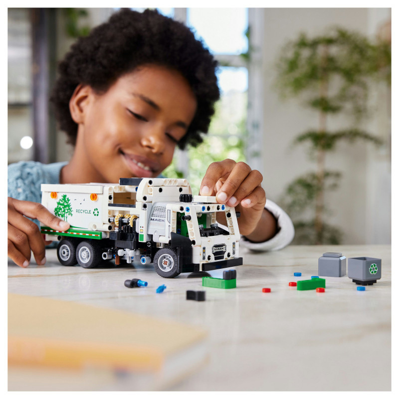 Truck toy for kids aged 8+ – The LEGO® Technic Mack® LR Electric Garbage Truck for boys and girls features a side loader to grab, lift and tip the rubbish bins