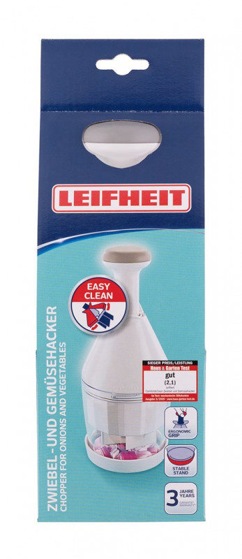 Leifheit 23030 Comfort & Clean — rankinė maisto pjaustyklė / smulkintuvas, skirta daržovėms, svogūnams, česnakams, riešutams, šokoladui ar kitoms smulkioms maisto dalims. Peilis yra pagamintas iš nerūdijančio plieno — ašmenys yra labai aštrūs, todėl pjaustymas vyksta lengvai ir efektyviai. Pjaustyklė veikia rankiniu būdu: sukdamas viršutinį minkštą rankenėlį valdai peilį, todėl nereikia papildomos elektros. Dėklas turi permatomą apačią, tad matyti supjaustytų produktų kiekis; maistas susirenka į talpą — stalviršis lieka švarus. Po naudojimo pjaustyklę lengva išvalyti — pakanka išskleisti šonines dalis ir nuplauti peilį po tekančiu vandeniu arba idėti į indaplovę.