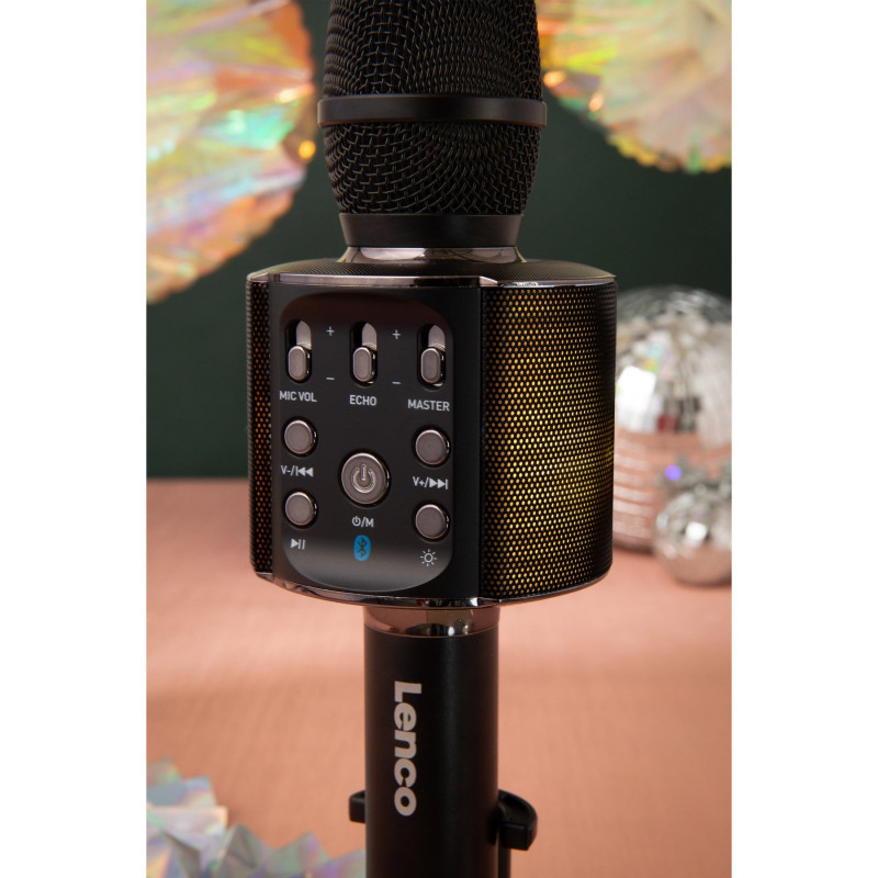 "Lenco BMC-090. Type: Karaoke microphone. Connectivity technology: Wireless, Device interface: Bluetooth, Maximum operating distance: 10 m. Product colour: Black, Housing material: Metal, Plastic, Control type: Buttons, Slider. Power source: Battery, Battery type: Built-in battery, Battery life (max): 8 h. Width: 80 mm, Depth: 75 mm, Height: 280 mm"\n"The Lenco BMC-090 is a karaoke microphone with a speaker that works via a Bluetooth® connection. Sing-a-long to your favourite songs and use the light and sound effects on this microphone to make your performance even cooler. This karaoke microphone has a rechargeable battery that lasts up to 8 hours so you, friends and family or acquaintances can enjoy themselves for hours on end. The microphone can also be connected to a HiFi set.