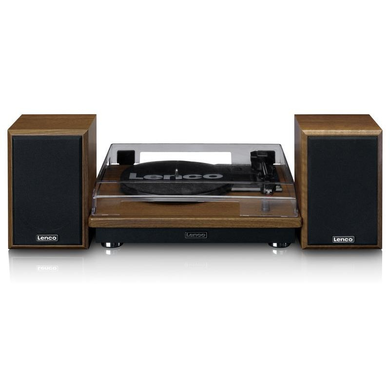 "Lenco LS-100WD. Type: Belt-drive audio turntable, Operation: Automatic, Product colour: Black, Oak. Bluetooth range: 10 m. Impedance: 4 Ω. Power supply type: AC, AC adapter input voltage: 100 - 240 V, AC adapter frequency: 50 - 60 Hz. Width: 340 mm, Depth: 320 mm, Height: 100 mm"\n"The Lenco LS-100WD is a record player and speaker set package.
