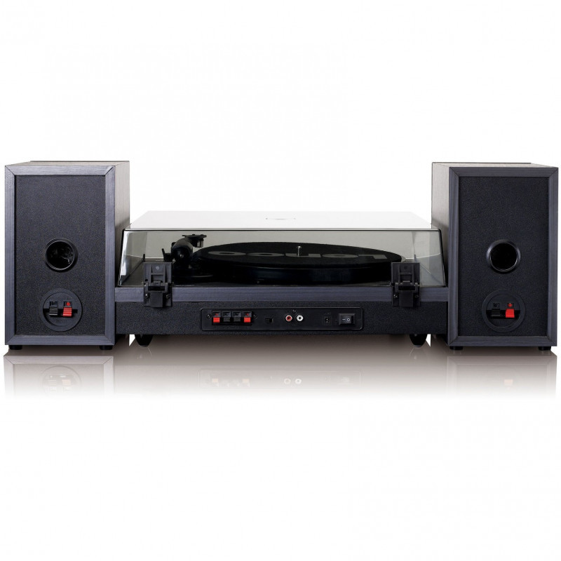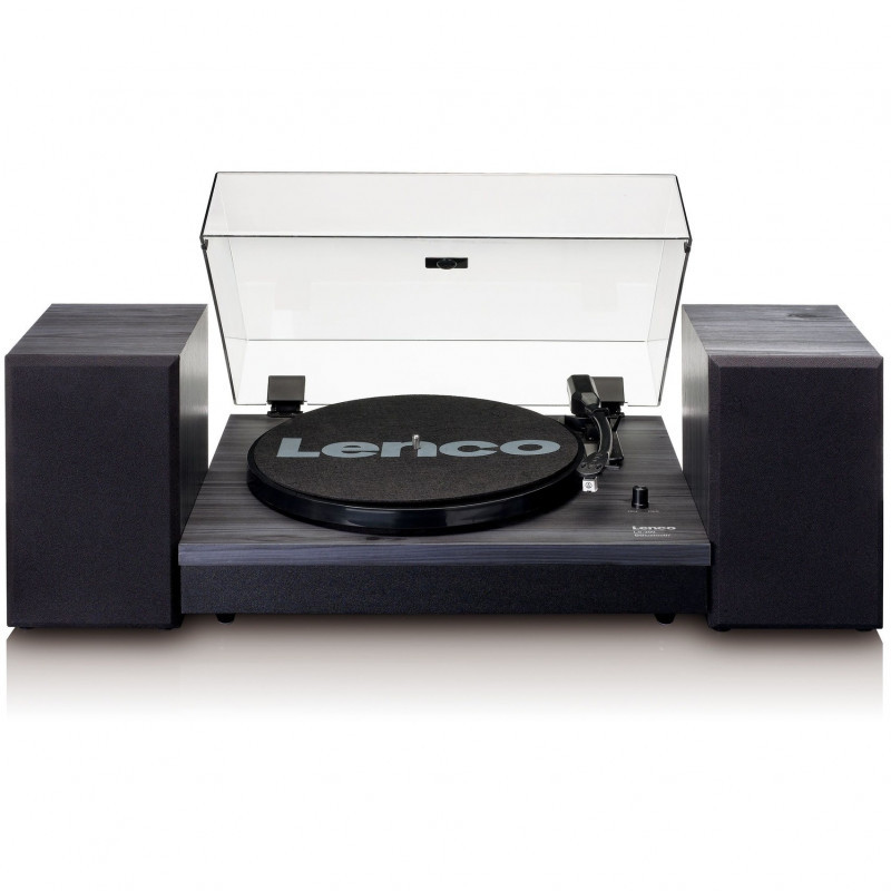 "Lenco LS-300. Type: Belt-drive audio turntable, Operation: Automatic, Product colour: Black. Shape: J-shaped tonearm. Power supply type: AC, Power consumption (typical): 24 W, Power consumption (standby): 1 W. Width: 438 mm, Depth: 350 mm, Height: 152 mm"\n"The Lenco LS-300 is a modern turntable with two loose speakers. Enjoy your favourite vinyl at a single press of a button. Forget complicated music systems, because the Lenco LS-300 effortlessly brings your records to life.