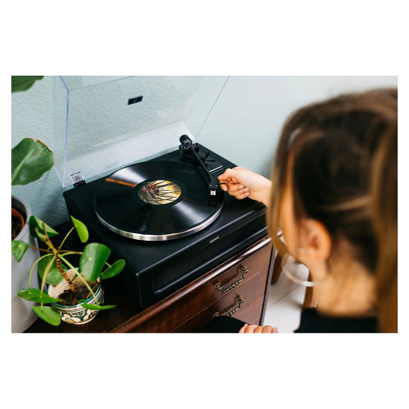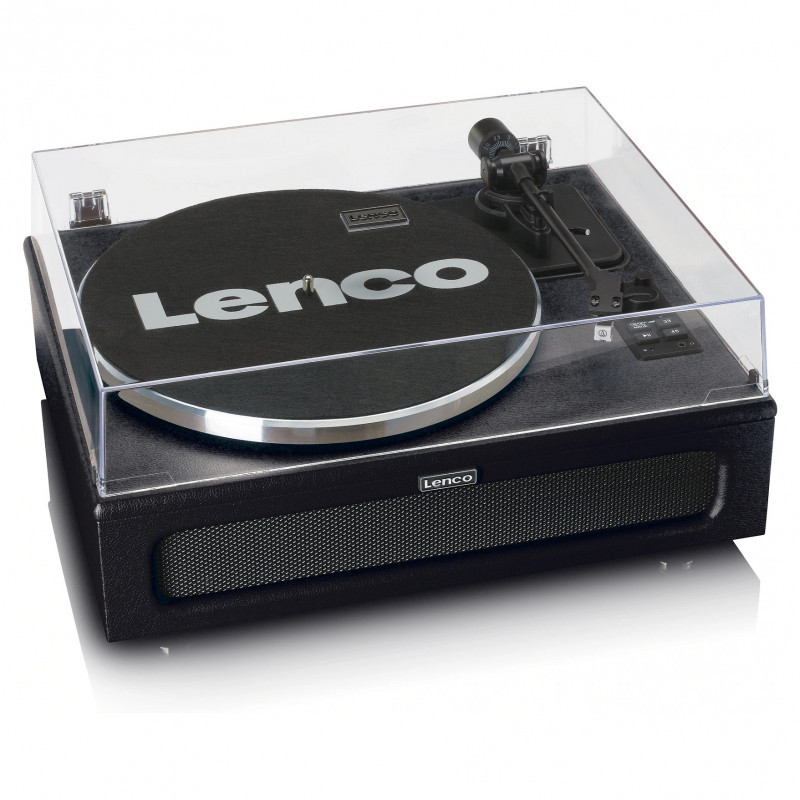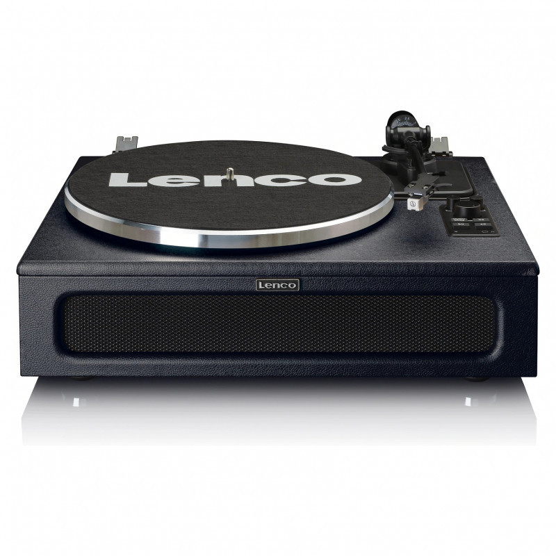 "Lenco LS-430BK. Type: Belt-drive audio turntable, Product colour: Black, Housing material: Faux leather, Metal, Plastic. Bluetooth range: 10 m. RMS rated power: 40 W. Power supply type: AC, AC adapter input voltage: 100 - 240 V, AC adapter frequency: 50 - 60 Hz. Width: 425 mm, Depth: 370 mm, Height: 192 mm"\n"The Lenco LS-430 is a turntable with built-in speakers. The four speakers (two 15 Watt speakers and two 10 Watt speakers) provide a nicely balanced sound. The turntable is easy to use. Simply plug it in and instantly enjoy your favourite LP! Alternatively, stream your playlist on your smartphone or tablet using Bluetooth® 5.0 to connect to the turntable’s speakers. If you want to retreat and relax with your favourite music, simply plug in headphones.