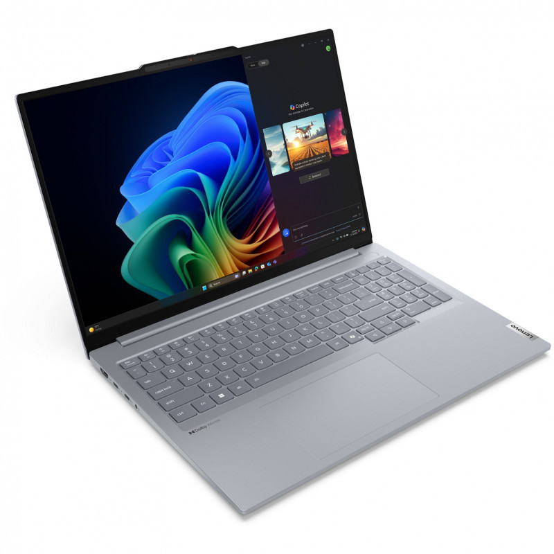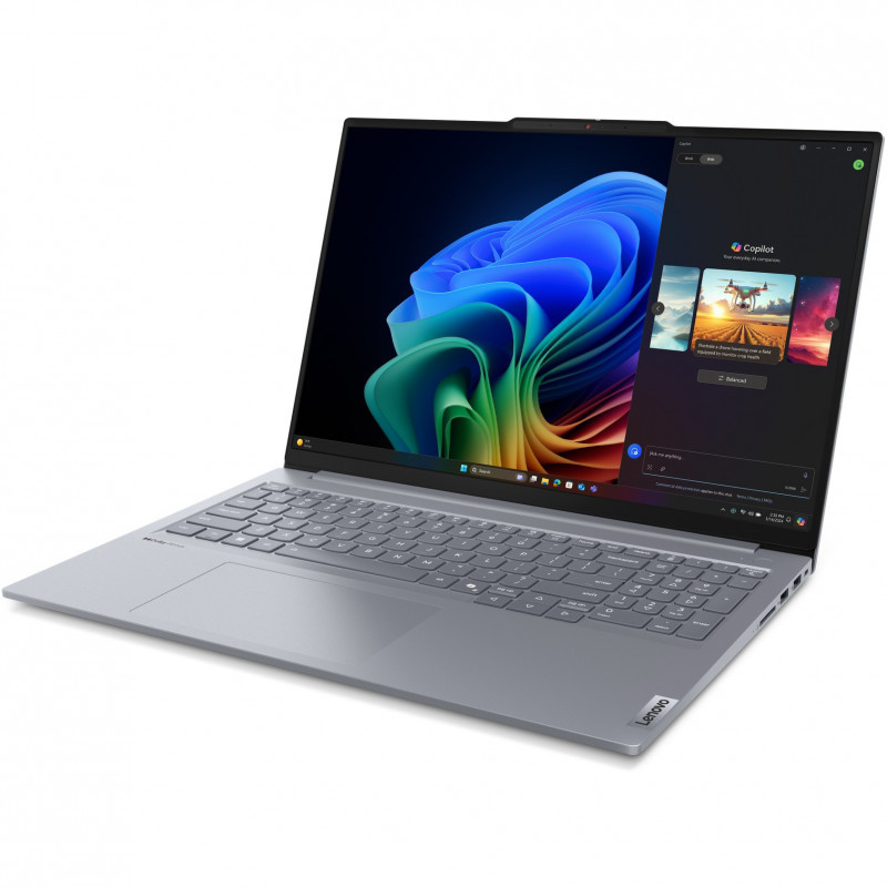 "Lenovo ThinkBook 16 G7 QOY Copilot+ PC. Product type: Laptop, Form factor: Clamshell. Processor family: Qualcomm Snapdragon, Processor model: X1P-42-100, Processor frequency: 3.4 GHz. Display diagonal: 40.6 cm (16""), HD type: WUXGA, Display resolution: 1920 x 1200 pixels. Internal memory: 16 GB, Internal memory type: LPDDR5x-SDRAM. Total storage capacity: 512 GB, Storage media: SSD. On-board graphics card model: Qualcomm Adreno GPU. Operating system installed: Windows 11 Pro. Product colour: Grey"\n