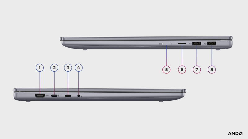 1x USB-A (USB 5Gbps/USB 3.2 Gen 1); 1x USB-A (USB 5Gbps/USB 3.2 Gen 1), Always On; 2x USB-C (USB 10Gbps/USB 3.2 Gen 2), with USB PD 3.0 and DisplayPort 1.4; 1x Headphone/microphone combo jack (3.5mm); 1x microSD card reader |