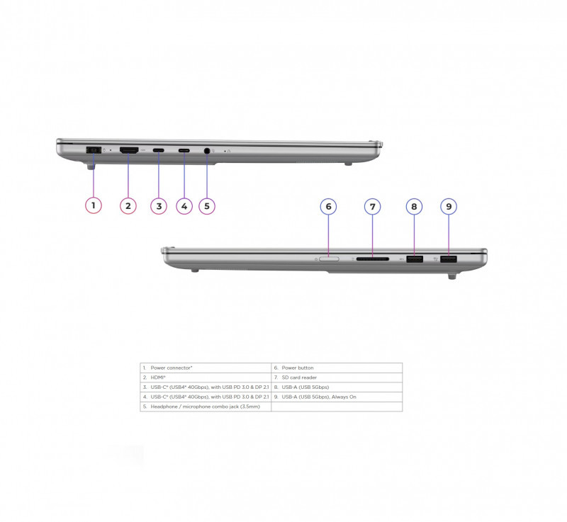 1x USB-A (USB 5Gbps/USB 3.2 Gen 1); 1x USB-A (USB 5Gbps/USB 3.2 Gen 1), Always On; 2x USB-C (USB4 40Gbps), with USB PD 3.0 and DisplayPort 2.1; 1x Headphone/microphone combo jack (3.5mm); 1x SD card reader |