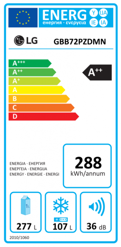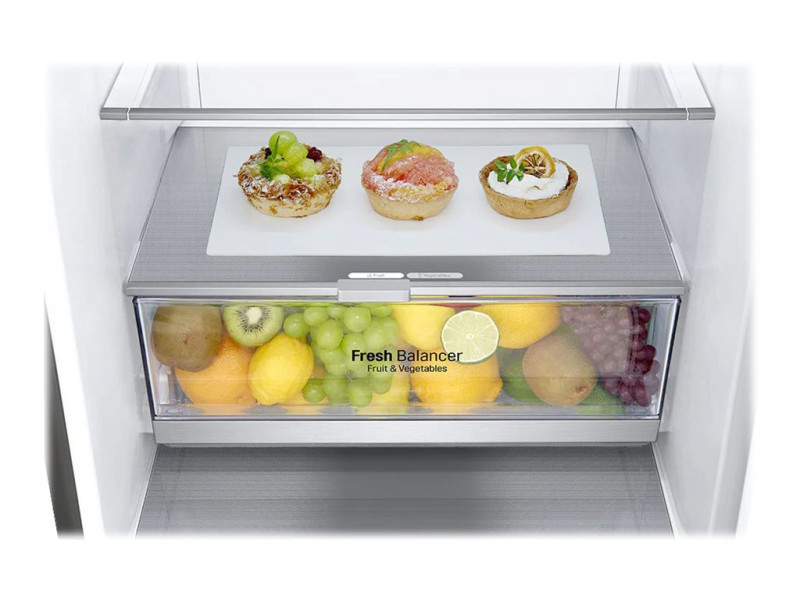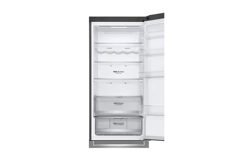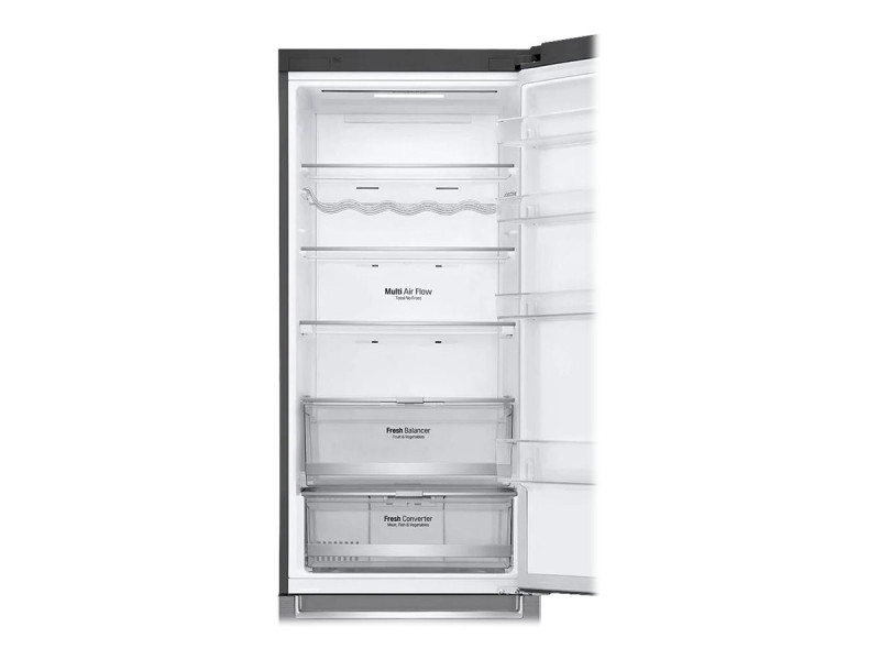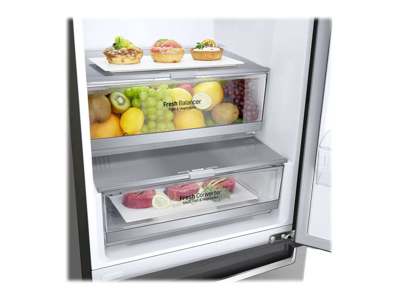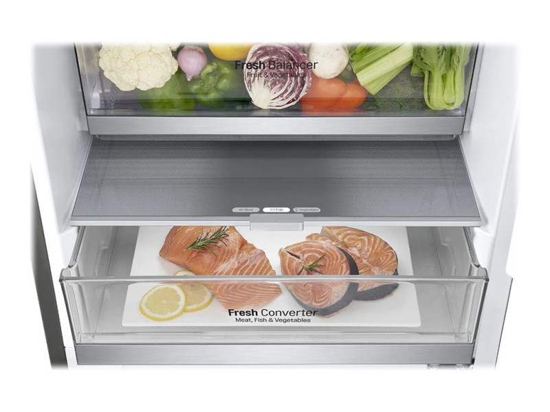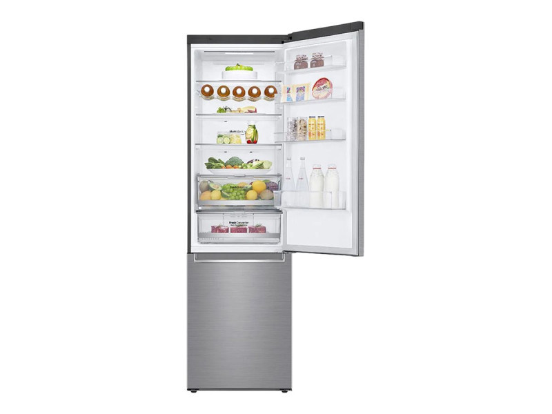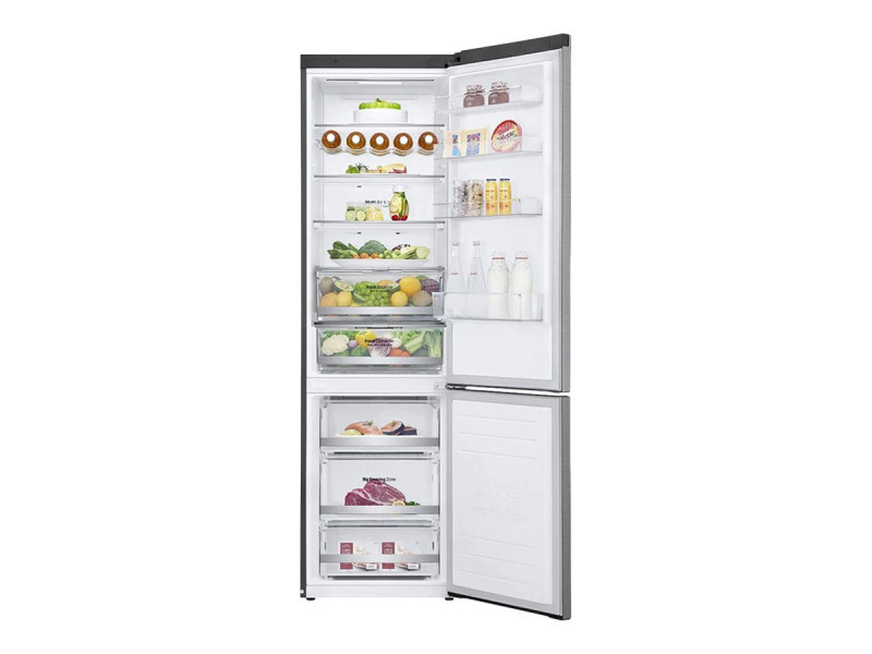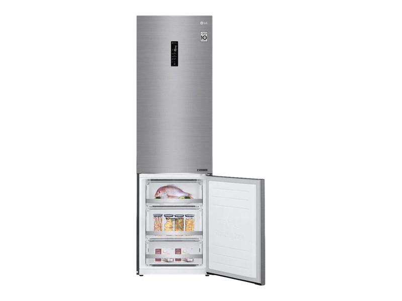LG | Refrigerator | GBB72PZDMN | Energy efficiency class E | Free standing | Combi | Height 203 cm | No Frost system | Fridge net capacity 277 L | Freezer net capacity 107 L | Display | 36 dB | Silver